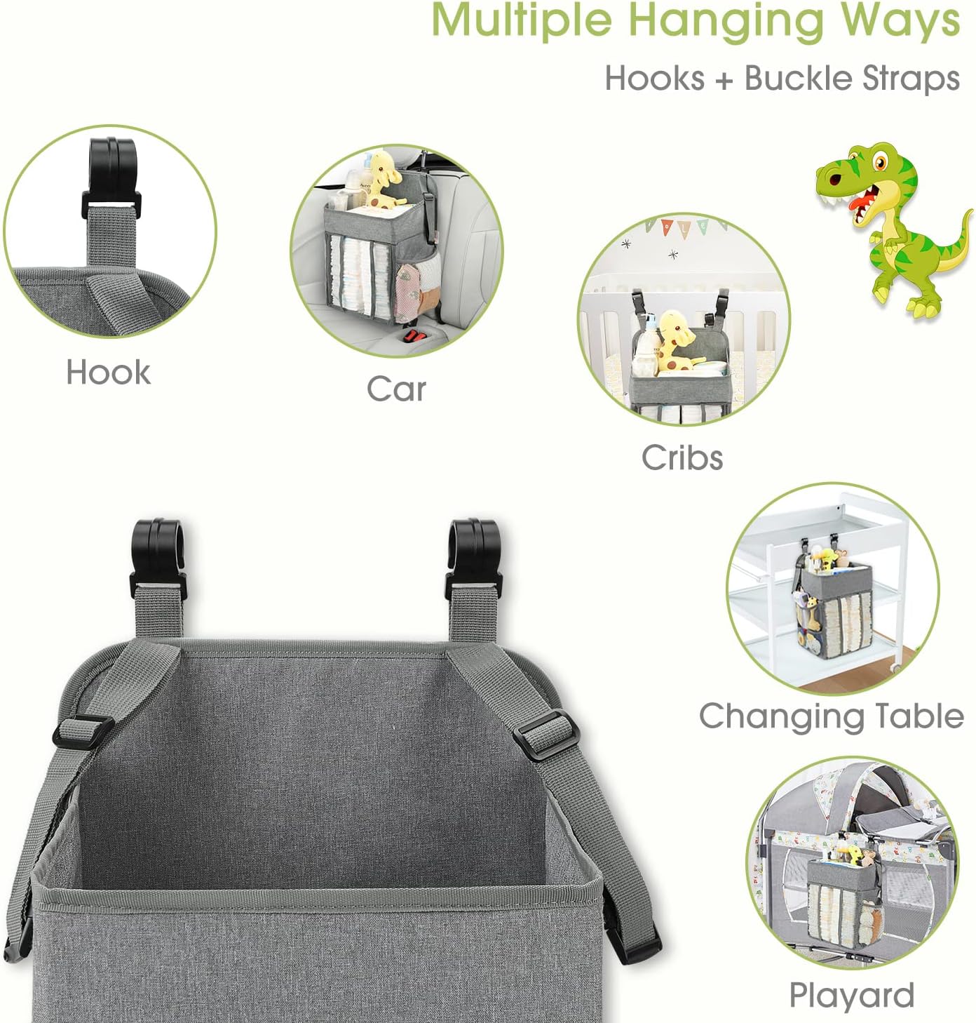 MULTIPLE HANGING WAY- Besides 2 C-clip hook onto all playard frames, this hanging diaper organizer has 2 extra adjustable buckle straps for modern cribs with thicker bar, dresser changing station, pack ‘n play and even your car: PLUS, the hanging holes are metal reinforced so the nursery organizer can be hanged on the wall by nails or wall mounted hook; So good baby stuff for newborn