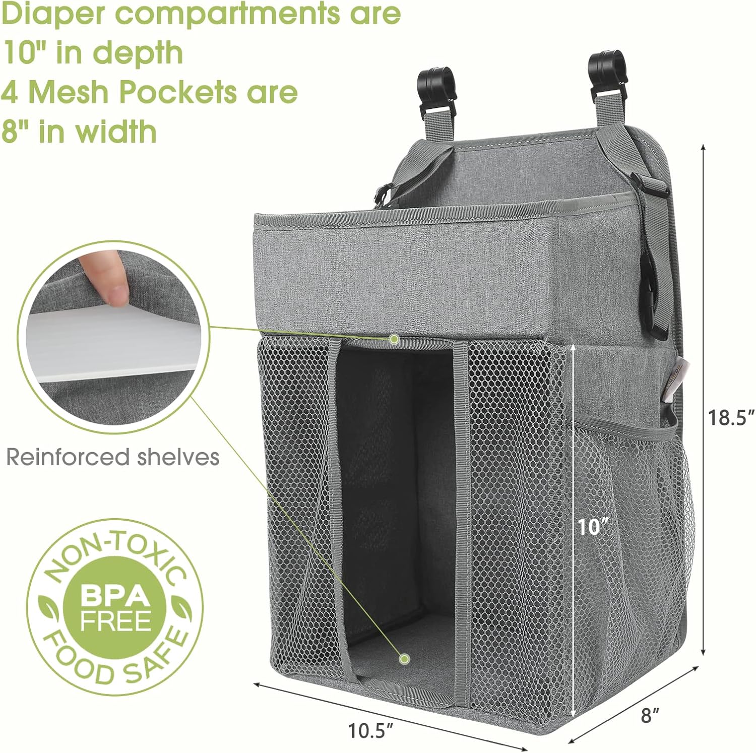 PREMIUM MATERIAL- Made with 600D Polyester Oxford cloth and quality mesh; This diaper storage organizer is durable and easy to clean; Material is BPA free and safe for your love little ones