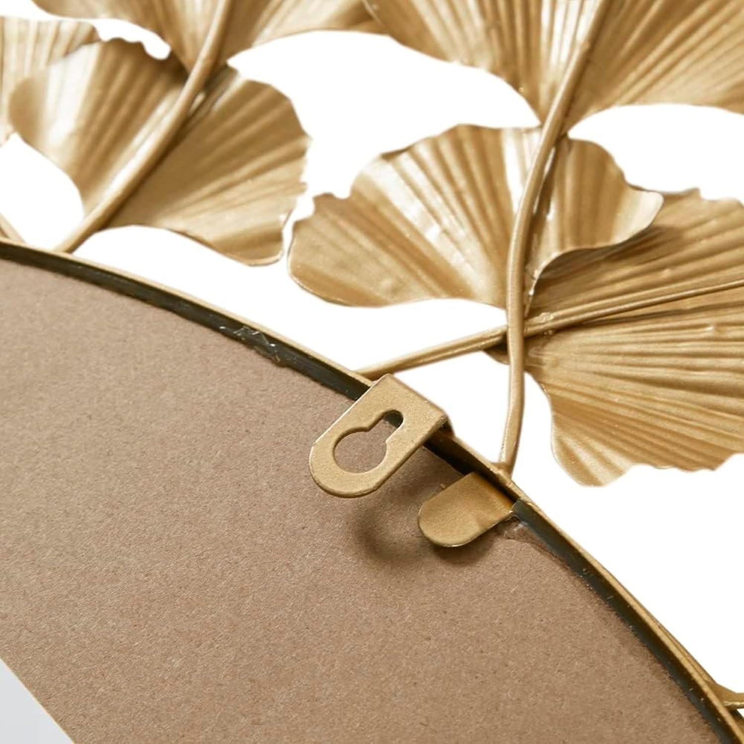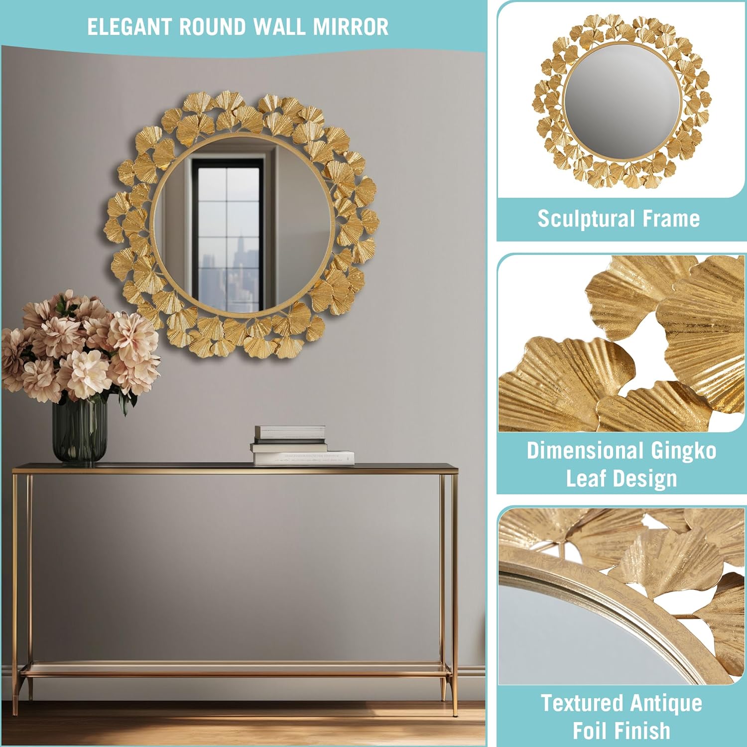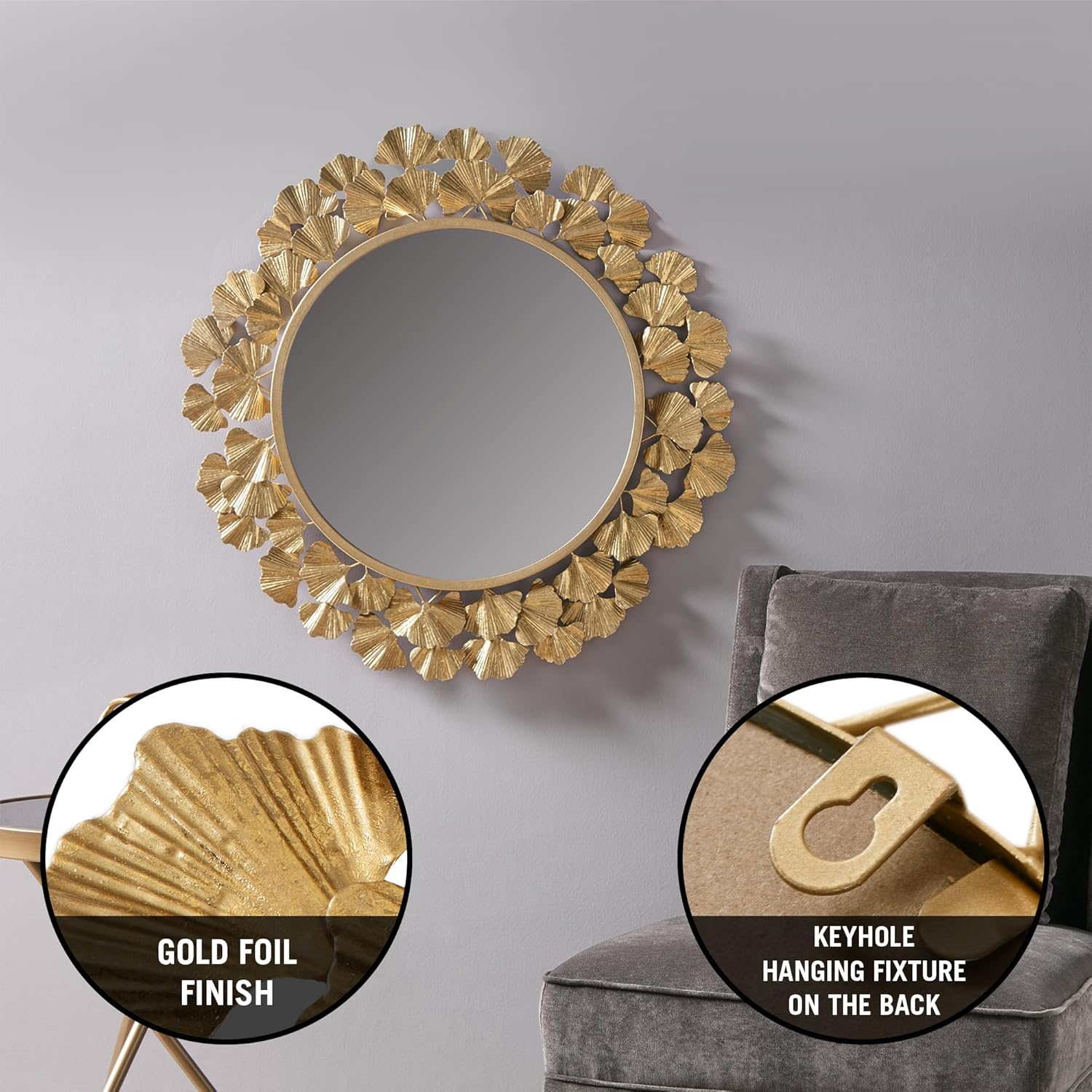 This round mirror showcases a sophisticated Ginkgo leaf design with a metal frame in a gold foil finish, creating a luxurious transitional look. It’s the perfect accent piece for your living room, entryway, or bedroom