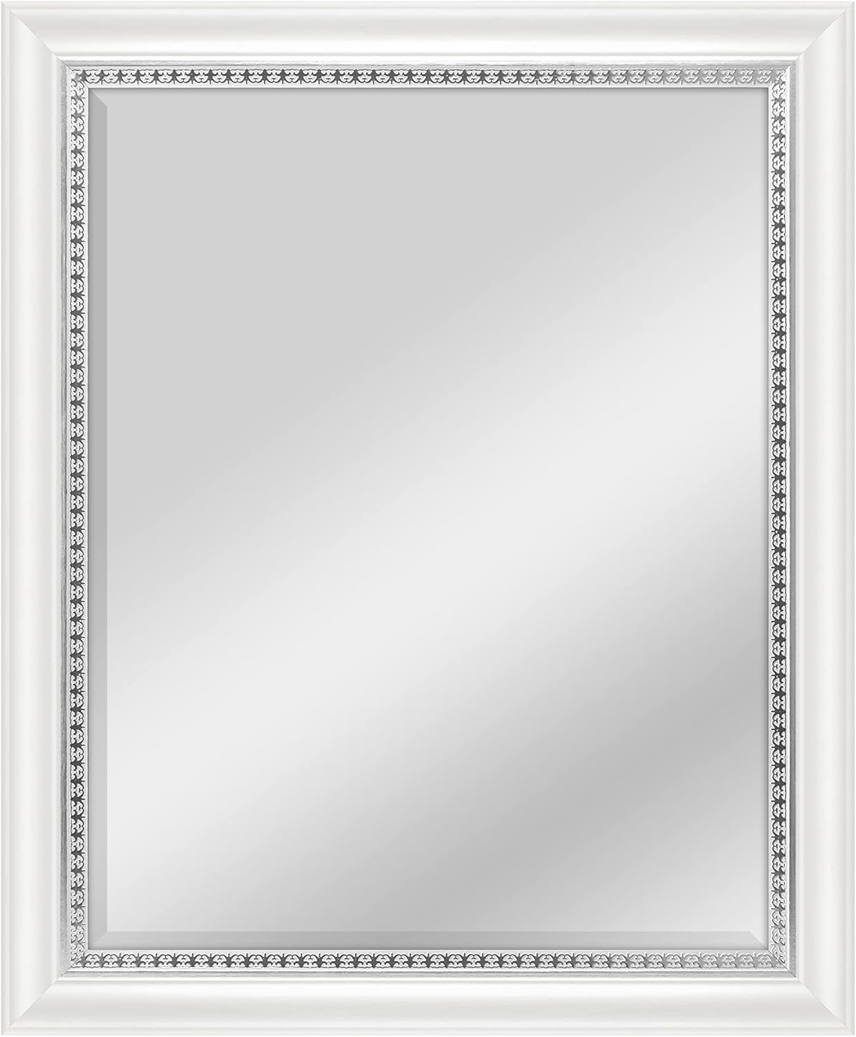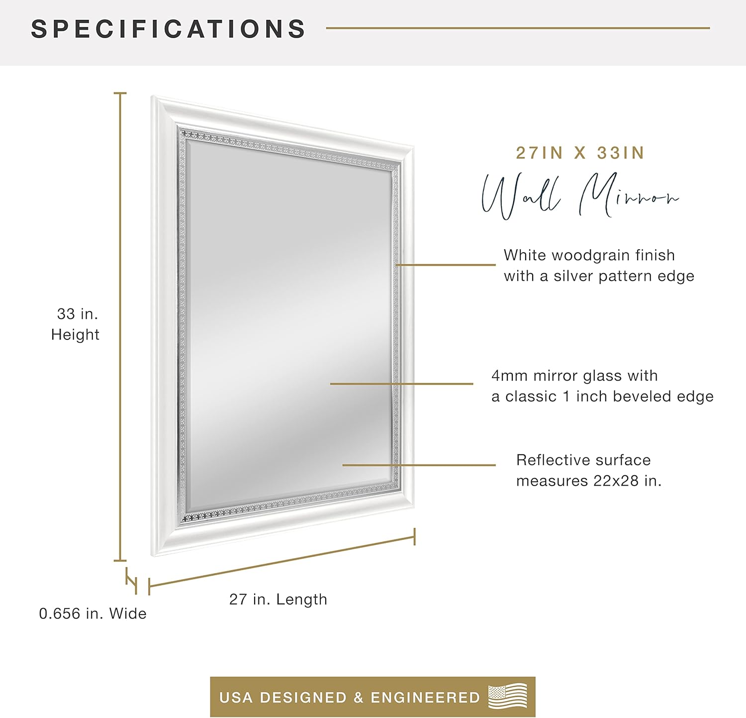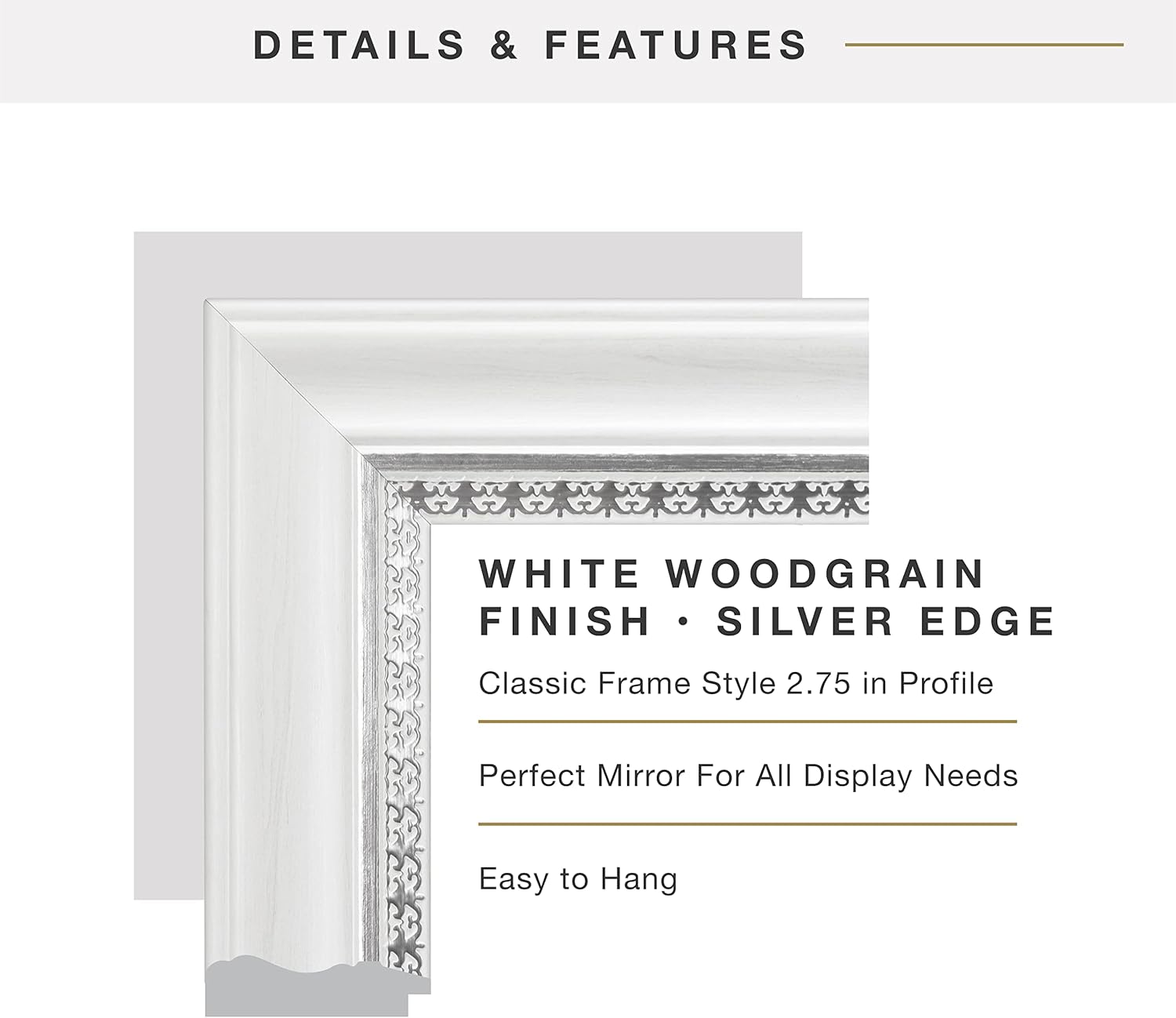 The 2. 75 inch wide frame has a white woodgrain with a decorative embossed silver inner edge