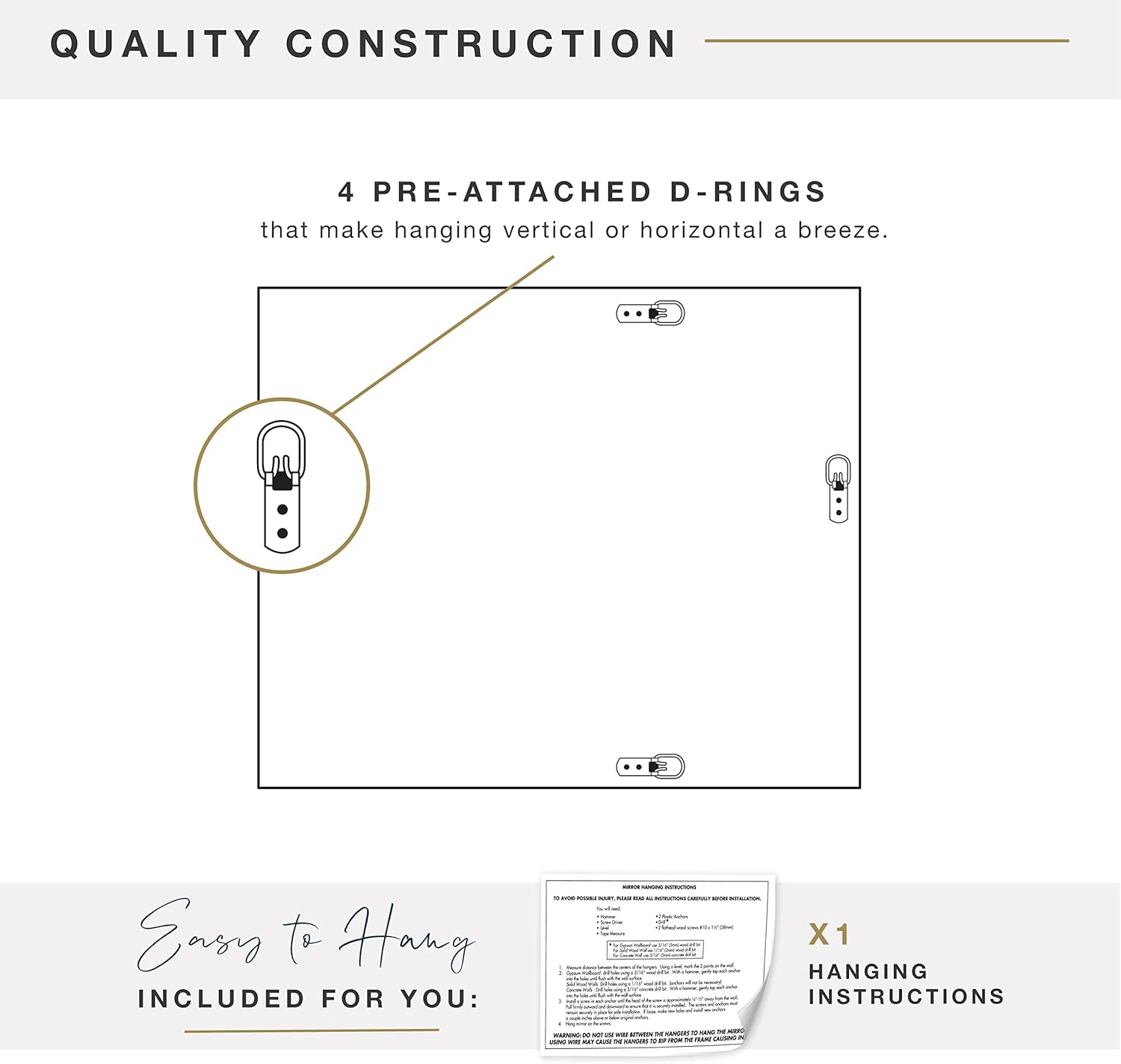 4 D-Ring hangers attached for quick and easy installation either vertically or horizontally.Frame Molding is made from polystyrene material and the mirror is glass