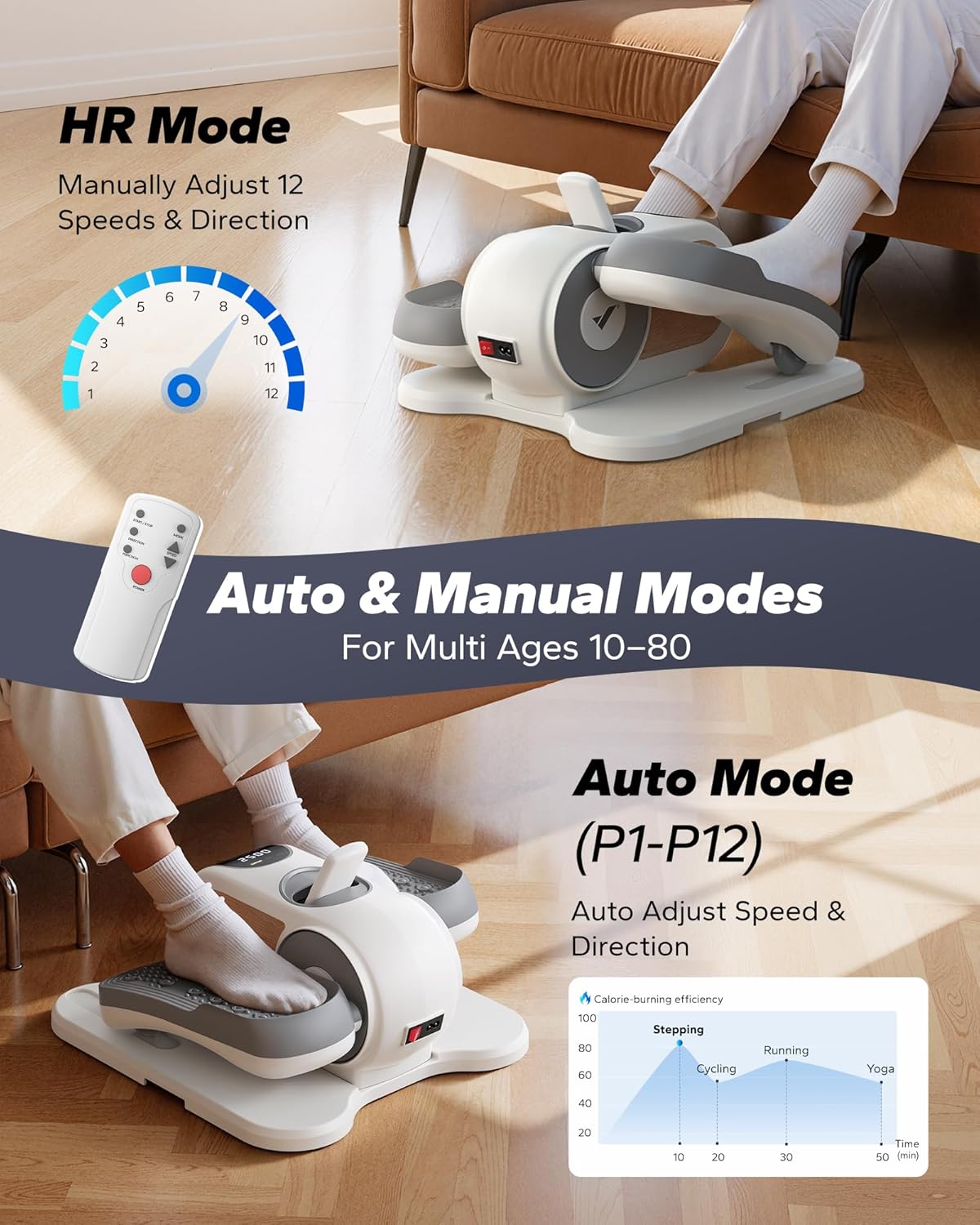 2-in-1 Auto & Manual Modes: With 12 manual speed levels and 12 auto modes (P1–P12), the leg exerciser while sitting for seniors lets you adjust intensity to fit your routine—at home or in the office. Merach pedal exerciser for seniors helps you stay active and achieve your fitness goals every day. The forward and reverse design engages different muscle groups for a well-rounded workout
