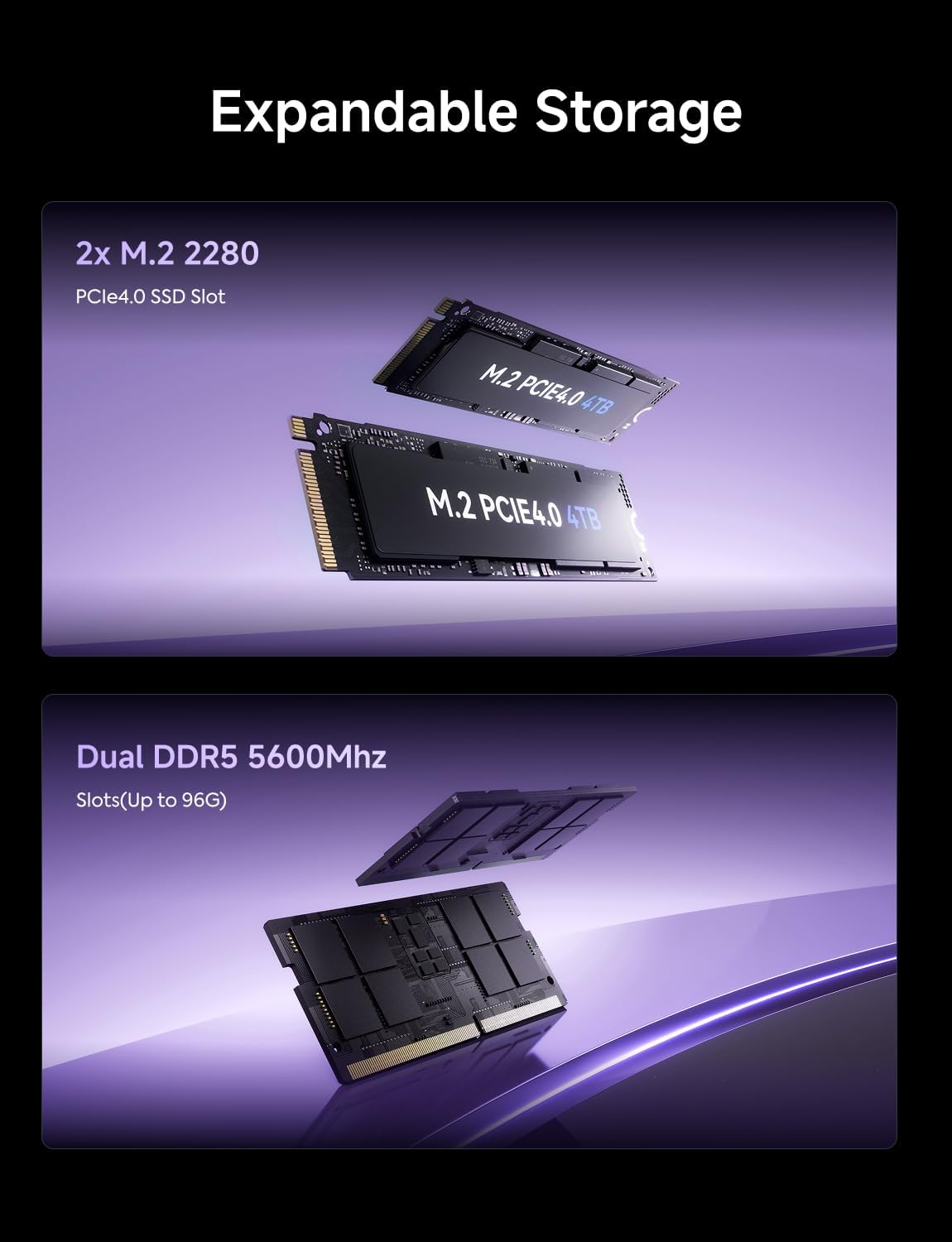 【Expandable Storage】 This Micro Computer has Dual SO-DIMM Slots(up to 96GB) and 2x M.2 2280 PCIe4.0 SSD Slots. You could expand the SSD up to 4TB. There two more PCIe4.0 SSD slots available for expanding the storage, total up to 12TB. Without worrying about lack of capacity, you can run software smoothly, watch and storage large-scale movies, photos without any stress.
