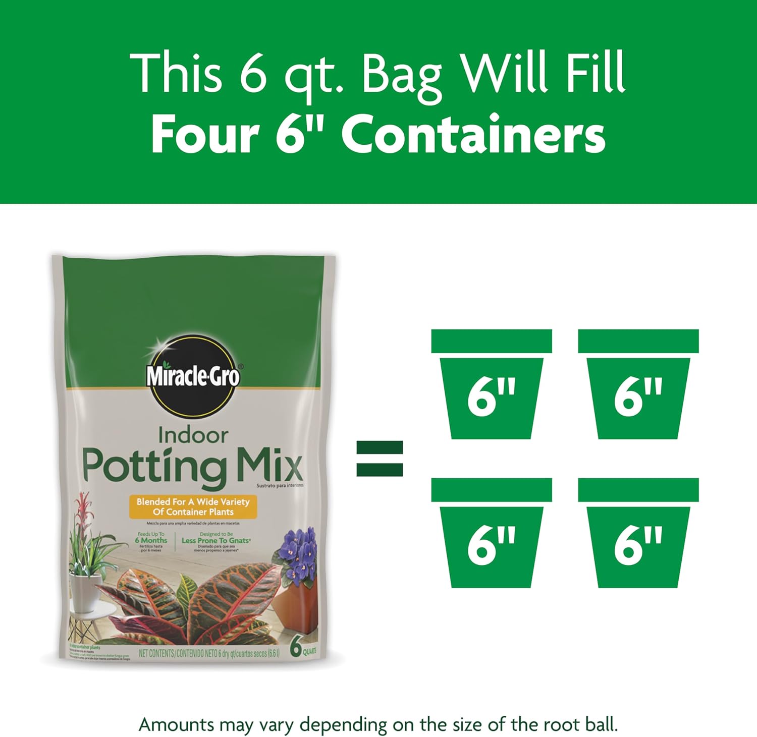 What’s included: This bundle includes two 6 qt. bags of Miracle-Gro Indoor Potting Mix, each able to fill four 6-inch containers (exact amount may vary based on the root ball size)