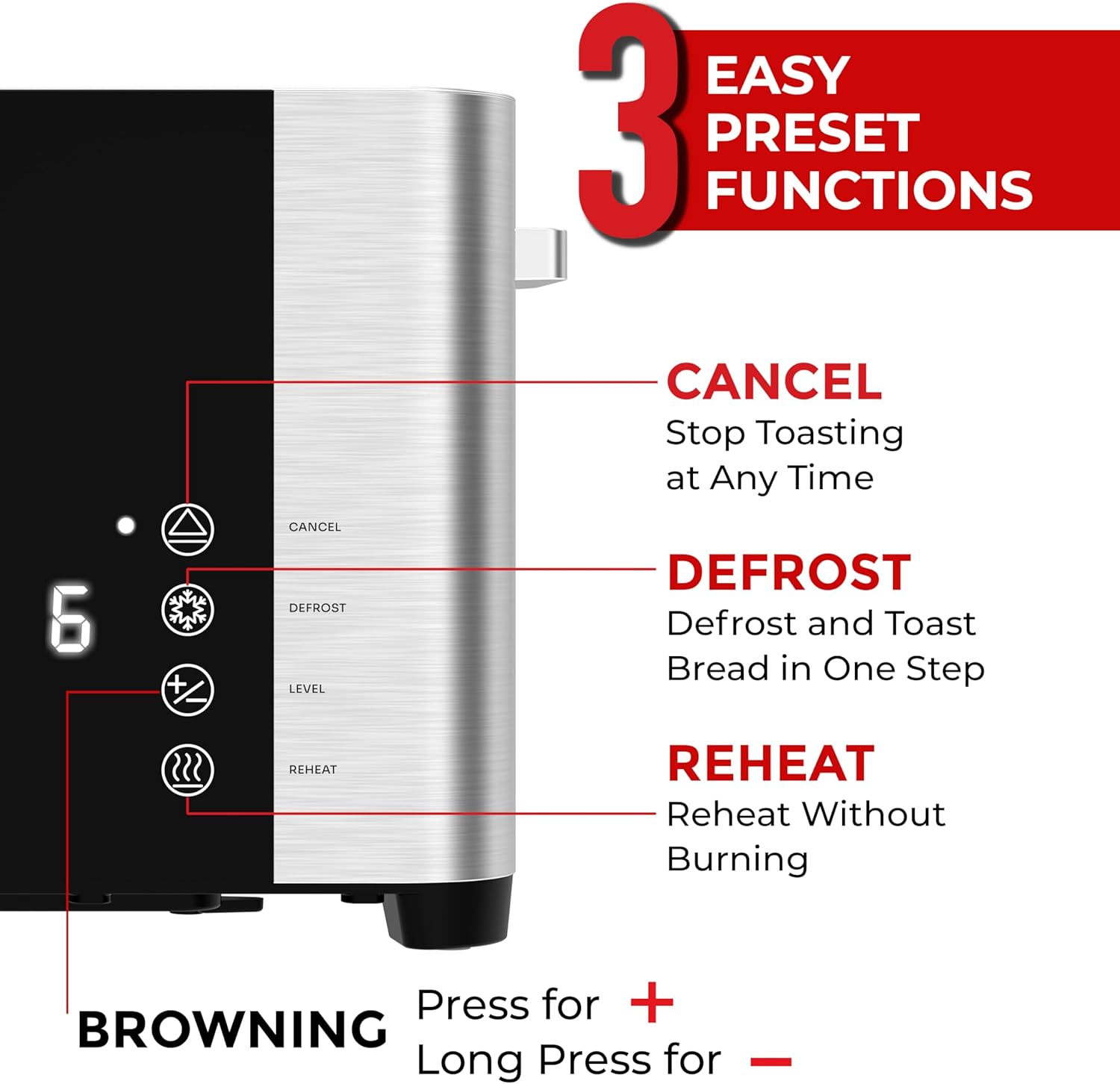 Full Control – Six browning settings let you take control of your toasting level so you can enjoy your toast exactly how you like it. With sleek touch buttons and an LED display, it’s super easy to switch between settings.