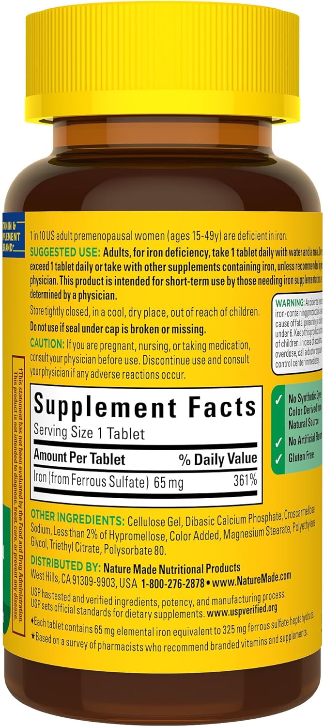 Nature Made Iron 65 mg (325 mg Ferrous Sulfate)(1) Tablets are for those with Iron deficiency and are vital for red blood cell formation. This Iron supplement also supports healthy cognitive function. Sourced from high-quality ingredients, this gluten free 65 mg Iron supplement has no synthetic dyes and no artificial flavors. These Nature Made Iron 65 mg tablets provide Iron for premenopausal women that need this essential nutrient during their reproductive years, and help support adequate Iron in the body. 1 in 10 US adult premenopausal women (ages 15-49) are deficient in Iron. Adults, for Iron deficiency, take one 65 mg Iron tablet daily with water and a meal. Start your day with Nature Made supplements. (1)Each tablet contains 65 mg elemental Iron equivalent to 325 mg ferrous sulfate heptahydrate. *Based on a survey of pharmacists who recommend branded vitamins and supplements. These statements have not been evaluated by the Food and Drug Administration. This product is not intended to diagnose, treat, cure or prevent any disease.