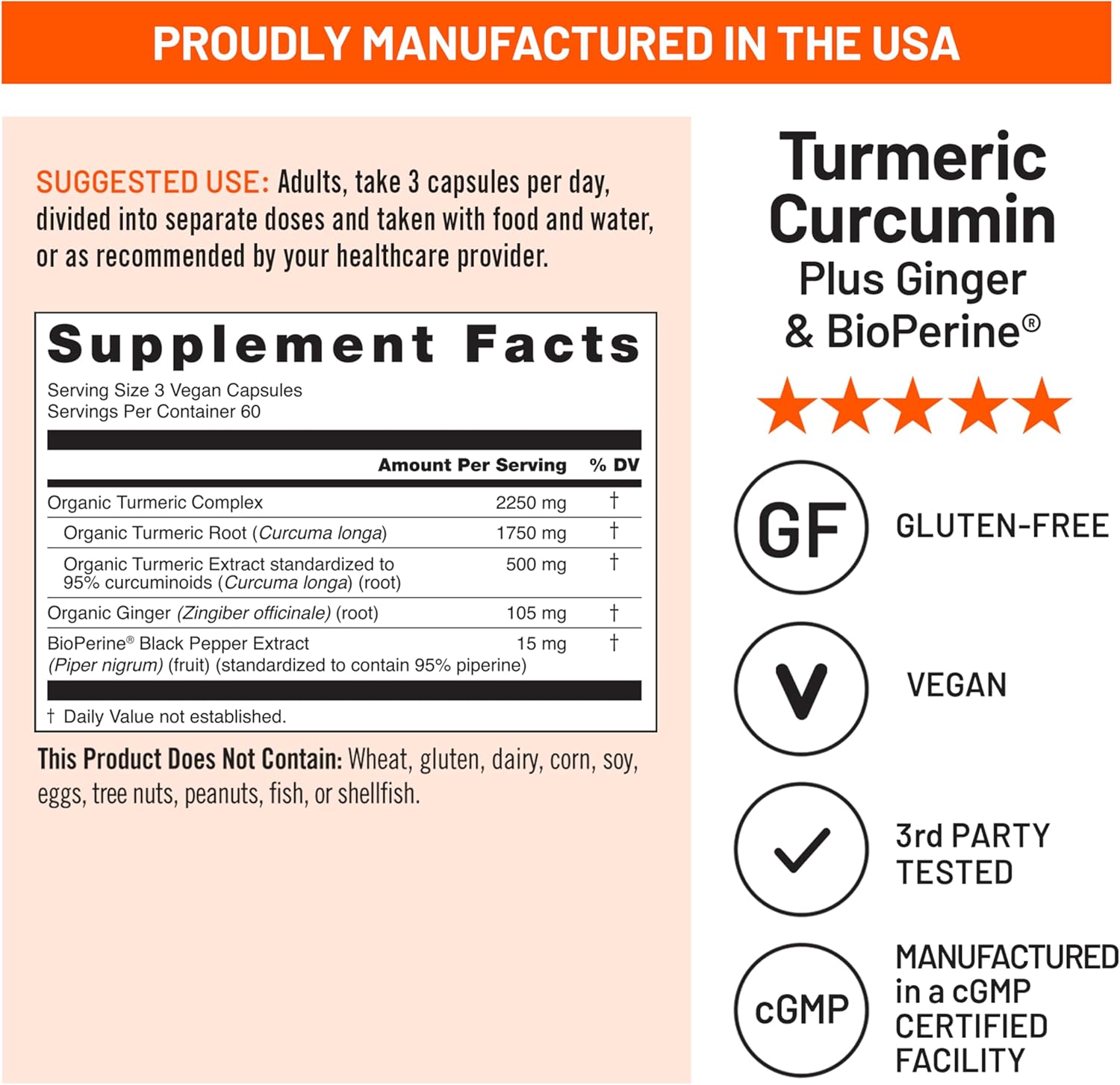 MADE WITH ORGANIC TURMERIC – CERTIFIED BY CCOF: This clean, non-GMO Turmeric Curcumin supplement is made with organic turmeric root, organic turmeric extract and organic ginger.