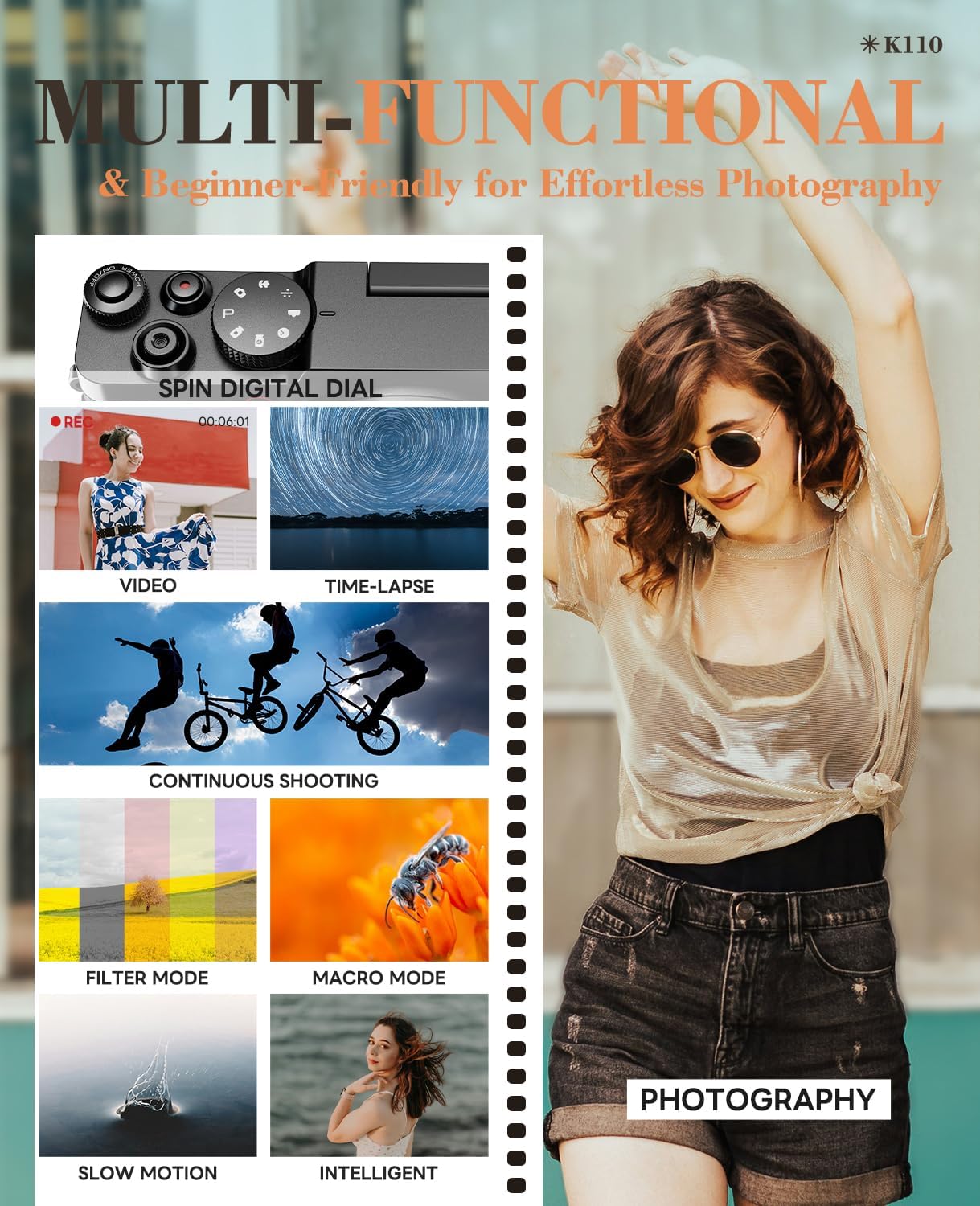 【Versatile Modes & Physical Dial】: Unleash your creativity with a full suite of modes: capture crisp photos, record smooth videos, slow down action, create stunning time-lapses, or add artistic filters—all in one camera. The intuitive physical mode dial lets you switch between functions in a split second, no fumbling through menus. Perfect for both quick moments and planned shots, it blends versatility with professional-level efficiency.