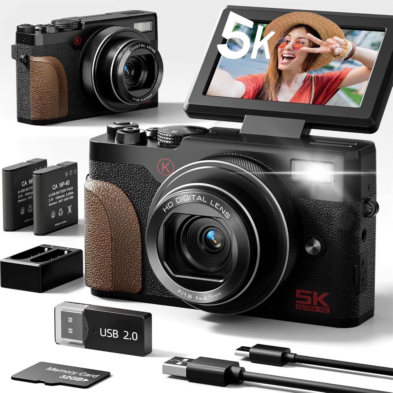 【Best Gift & Abundant Freebies】:The package contains a 5K & 64MP camera, 2 batteries, charger, 32GB TF card set & USB cable. Loaded with accessories, no need for extra buys. With sleek design and top-notch features, this camera is a knockout gift for photo enthusiasts, any time.