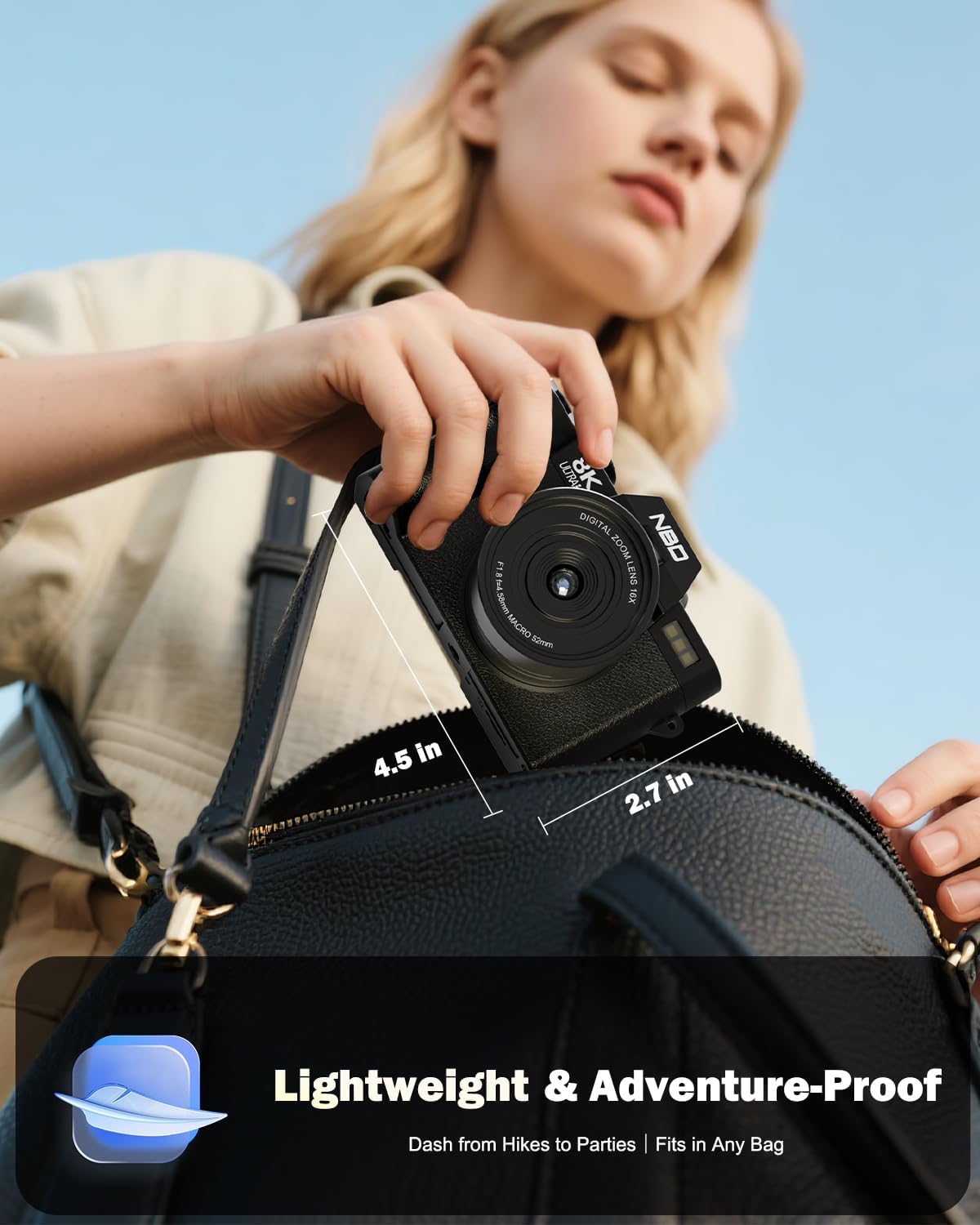 【8K Travel Vlogging Camera】:It captures stunning 8K footage and smooth 5K/25fps video, delivering exceptional clarity and detail.Featuring a 180° flip-up screen, this camera is ideal for travel vlogging and on-the-go content creation.Edit and share directly via the dedicated app for seamless social media publishing.