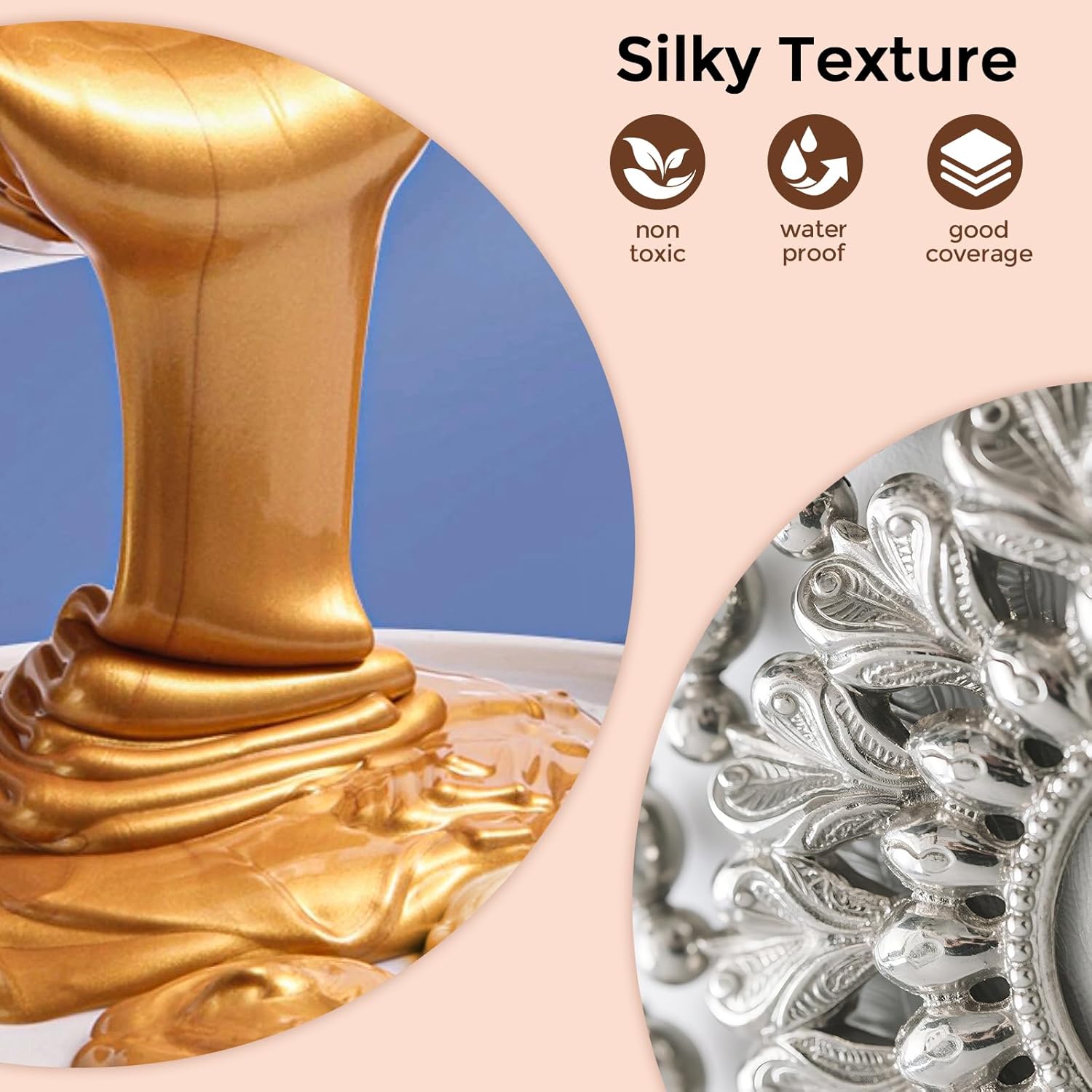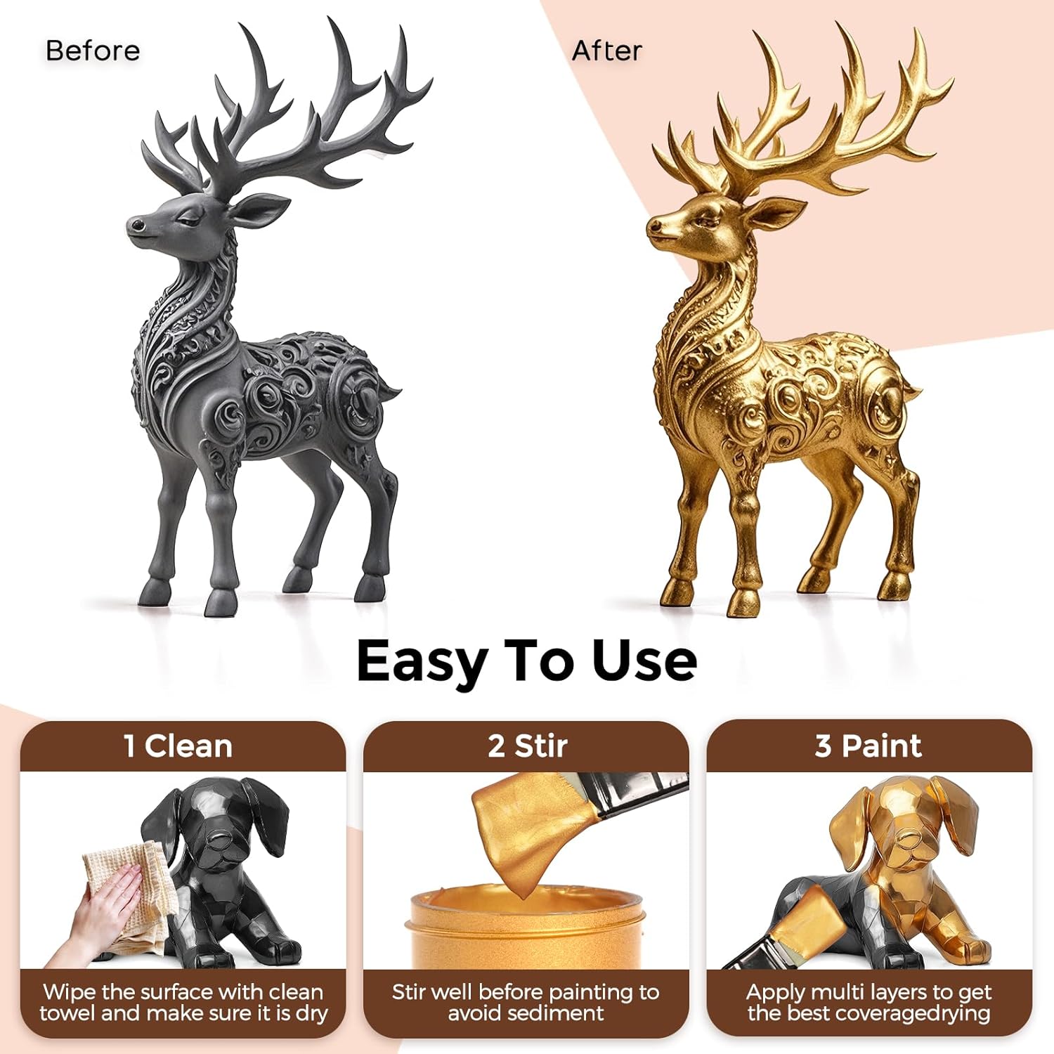 Easy To Use: You need to remove oil or dust on the work surface, keep surface clean and dry first. Then mix the gold paint evenly before you start painting. Paint glides on smoothly and dries quickly with minimal streaking—perfect for both large fills and fine detail work.