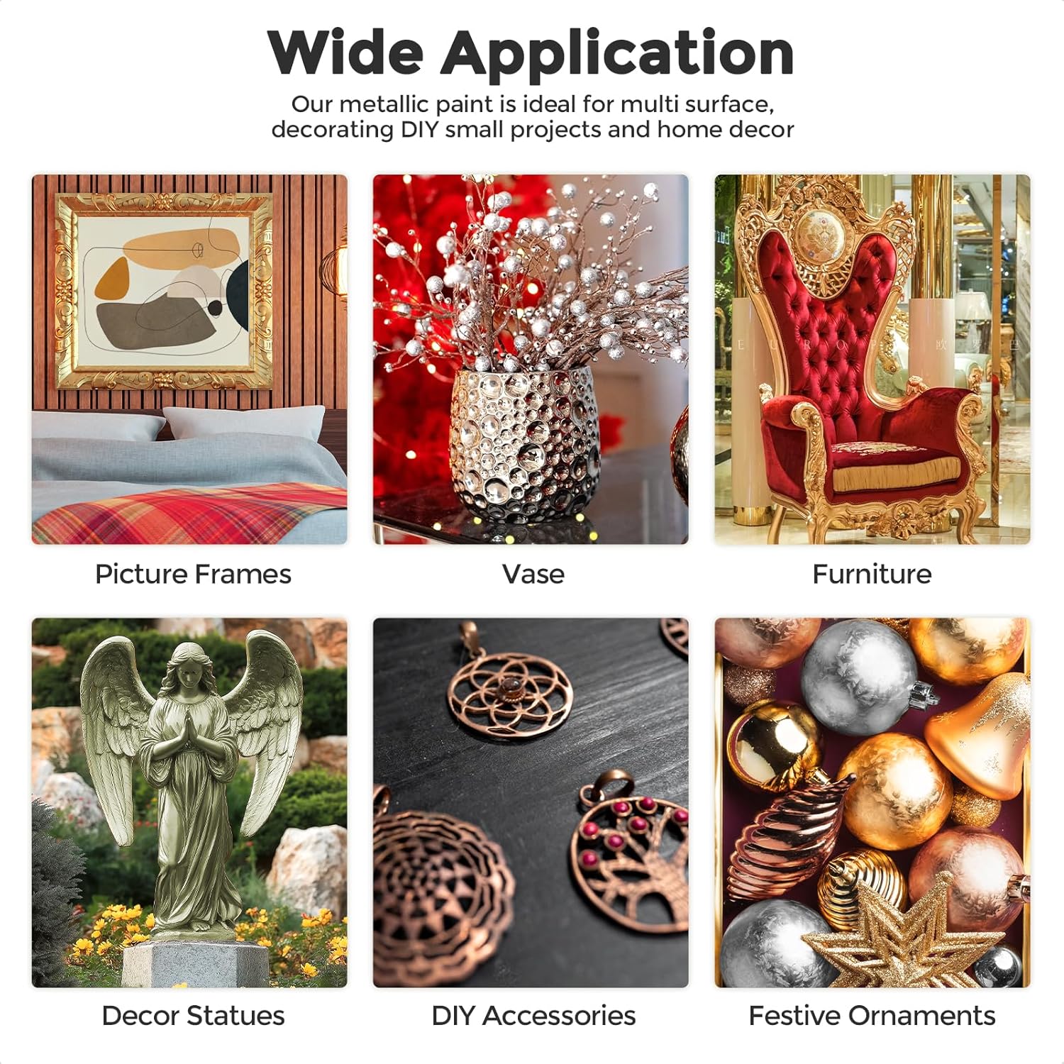 Stunning Metallic Finish: Nicpro metallic acrylic paint set includes 6 colors Gold, Silver, Copper, Brass, Bronze, and Deep Gold. Each dries to a high-gloss metallic finish that delivers a rich, reflective shine with a gold leaf-like effect—perfect for canvas art, home décor, and seasonal crafts.