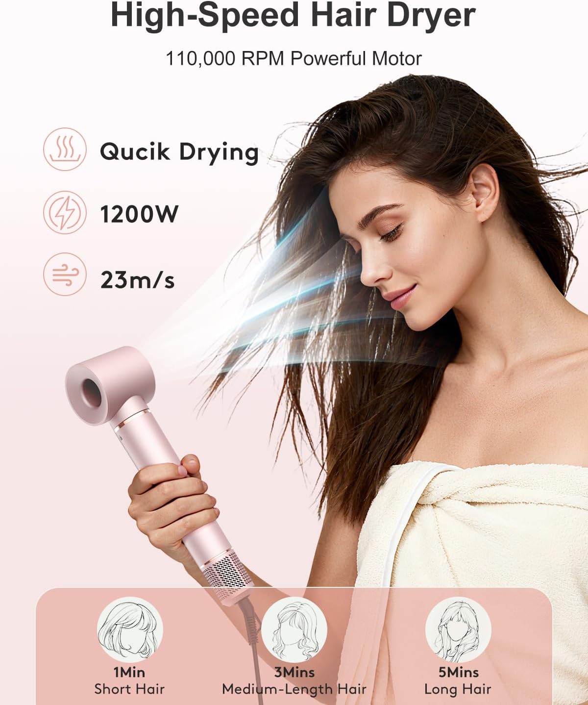 No Heat Damage: The hair dryer Gives you fast drying while maintaining low heat, rather than getting hotter as it runs, This hair styler and dryer with intelligent thermal control can automatically detect the air temperature, thus controlling it below 210°F to avoid irreversible heat damage to the hair.