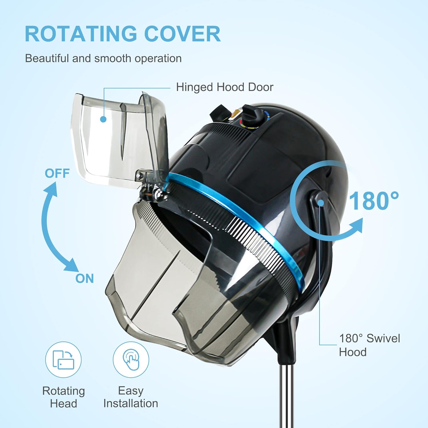 Hooded Hair Dryer: The stand up hair dryer adopts advanced counterclockwise airflow gently penetrating into heated hair by 360 degree rotating for even treatment and superior comfort, ensuring complete satisfaction from every angle