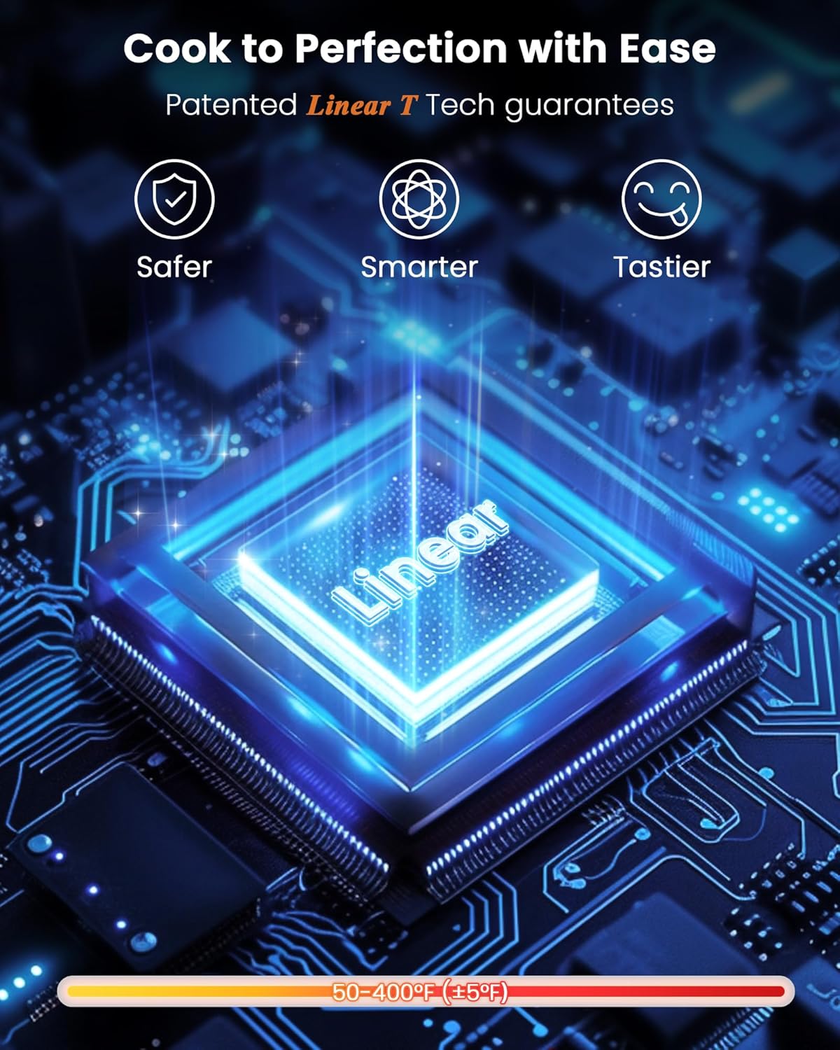 AUTO SHUTOFF & LINEAR T TECHNOLOGY: Precisely adjust cooking temps from 50°F to 400°F anytime, with auto-shutoff for safety. Patented Linear Tech guarantees perfect results by monitoring and adjusting power, every dish is cooked to perfection every time.