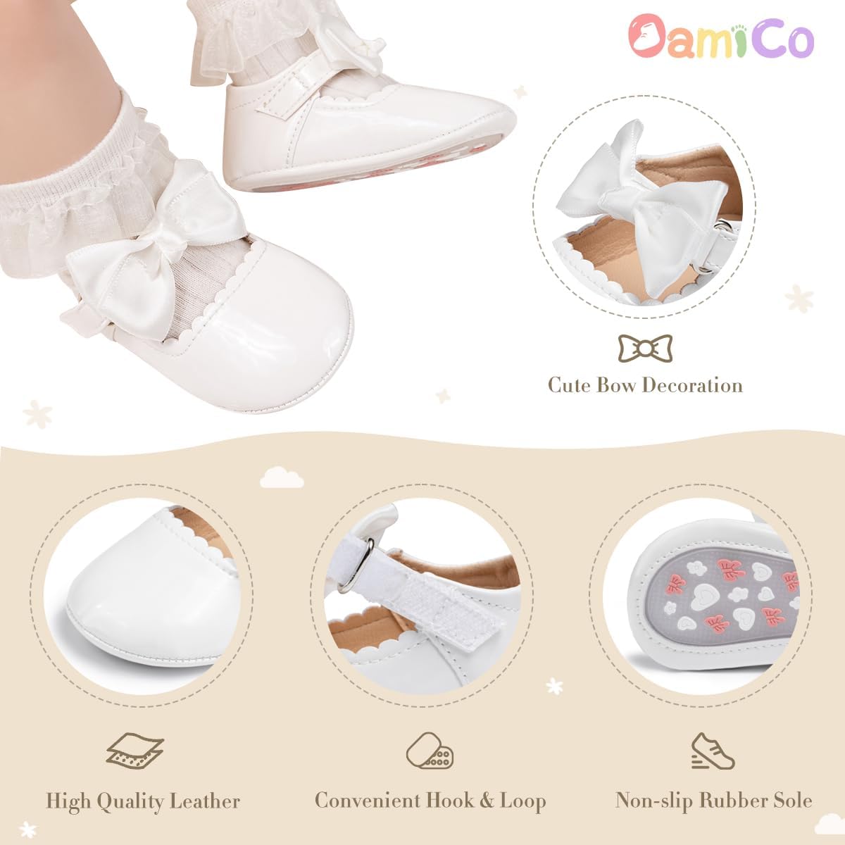 Oamico Infant Baby Girls Mary Jane Flats Non Slip Rubber Sole with Bownot Toddler First Walkers Princess Wedding Dress Shoes
