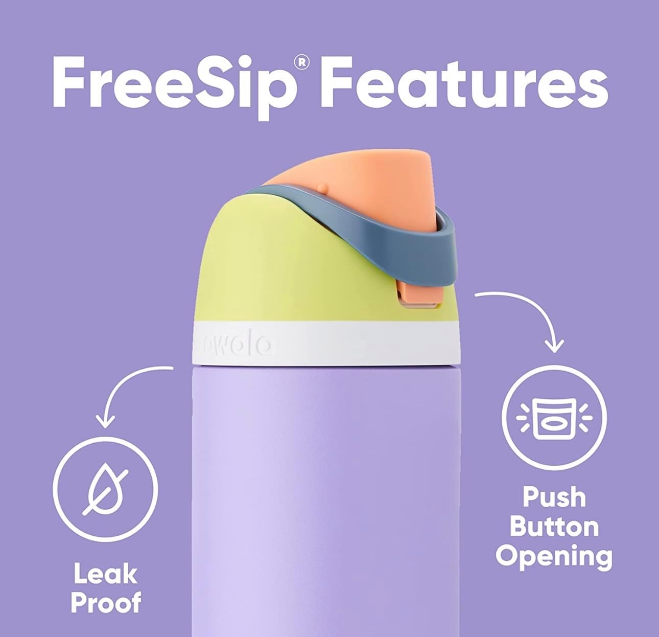 The Owala FreeSip Insulated Stainless-Steel Water Bottle with Locking Push-Button Lid easily tackles every thirst. With a built-in, easy-clean straw and a wide-mouth opening, the FreeSip reusable bottle is designed for drinking two different ways: sipping upright through the straw or tilting back to swig from the wide-mouth spout opening. Add in a push-to-open lid and playful colors, and staying hydrated has never been simpler—or more fun. Additional features include double-wall insulated stainless steel that keeps drinks cold up to 24 hours, a carry loop that doubles as a lock, a cup holder-friendly base, and a wide opening for easy cleaning and adding ice. The Owala FreeSip Insulated Stainless-Steel Water Bottle with Locking Push-Button Lid is available in three sizes: 24-Ounce, 32-Ounce, and 40-Ounce. Lid is dishwasher safe; hand wash cup. Not for use with hot liquids. Manufacturer’s limited lifetime warranty.
