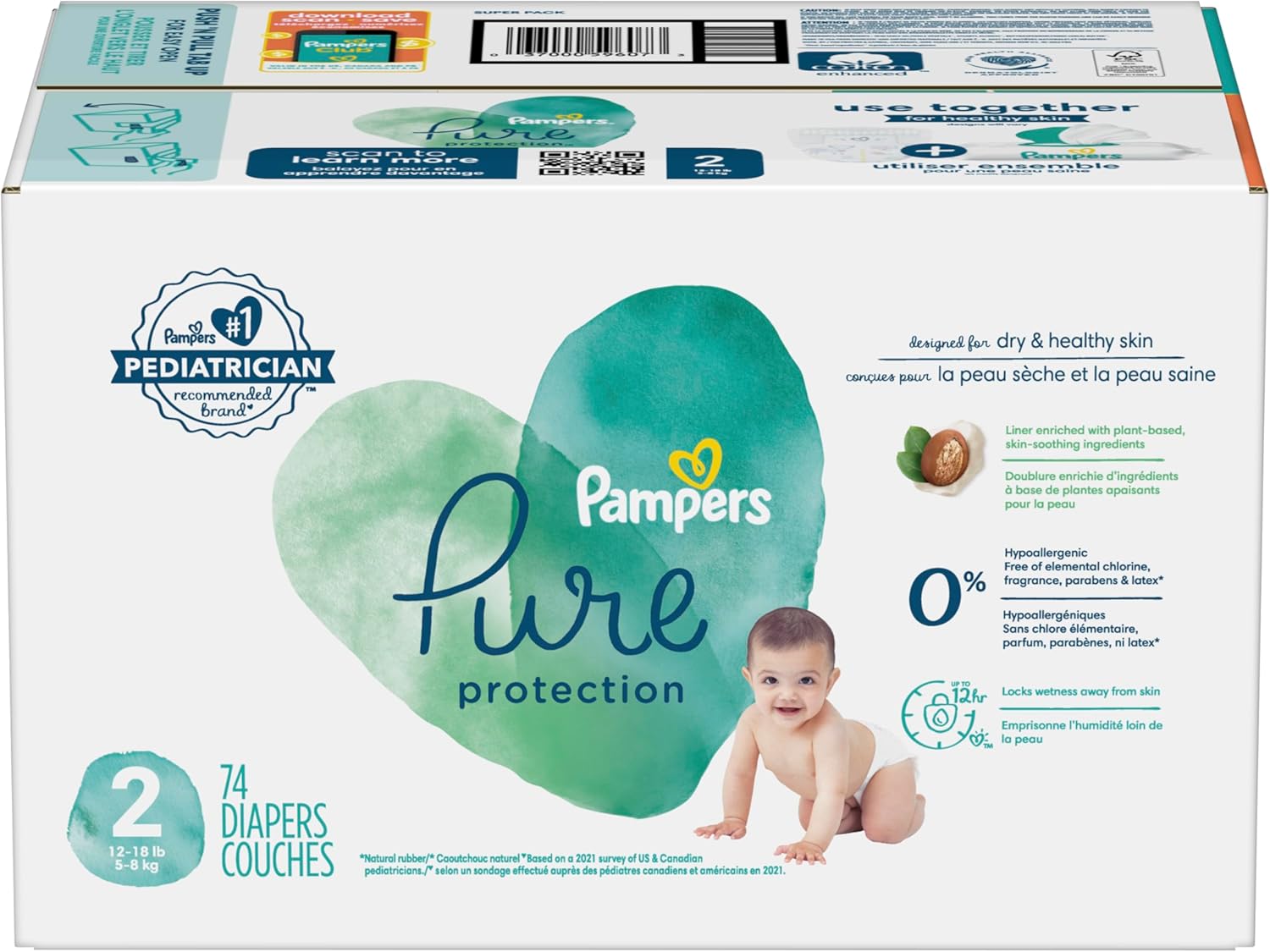 Pure protection. Plant-based. 100% leakproof. The search is over—everything you’ve been waiting for in a diaper, you’ll find with Pampers Pure. Pampers Pure are premium diapers carefully crafted with plant-based ingredients and a shea butter infused liner to help protect baby’s sensitive skin. Pampers Pure diapers are hypoallergenic, no fragrance, no paraben, no latex**, and elemental no chlorine. Featuring improved softness and an absorbent Lockaway Core that stays 2X drier for healthy skin, Pampers Pure diapers are uniquely made to give your baby the utmost care and protection. Our luxury diapers are approved by dermatologists and the Skin Health Alliance. Plus, our designer prints make Pampers Pure just as precious as the babies they are protecting. Discover trusted skin protection from the #1 pediatrician recommended brand, Pampers. All Pampers diapers are assembled in the U.S.A. From domestic and imported materials with zero waste to landfill in our factories. *Liner enriched with plant-based, skin-soothing ingredients. **Natural rubber. Vs. Honest diapers. Baby Care – Global.