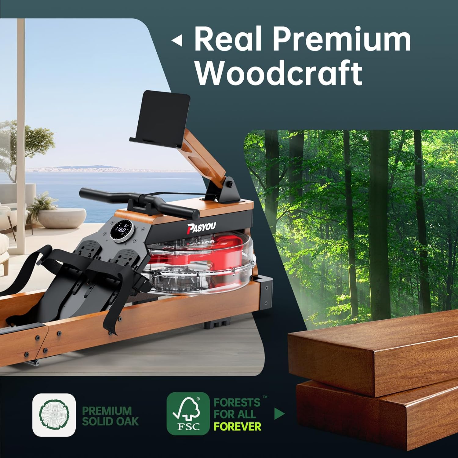 Environmental Oak Wood Craftsmanship: Crafted from premium oak wood, the Pasyou water rowing machine delivers superior stability and a long-lasting workout platform. With a 350lb weight capacity and an extra-long 35 inch rail, it comfortably accommodates users up to 6’7″—making it ideal for all body types and fitness levels.