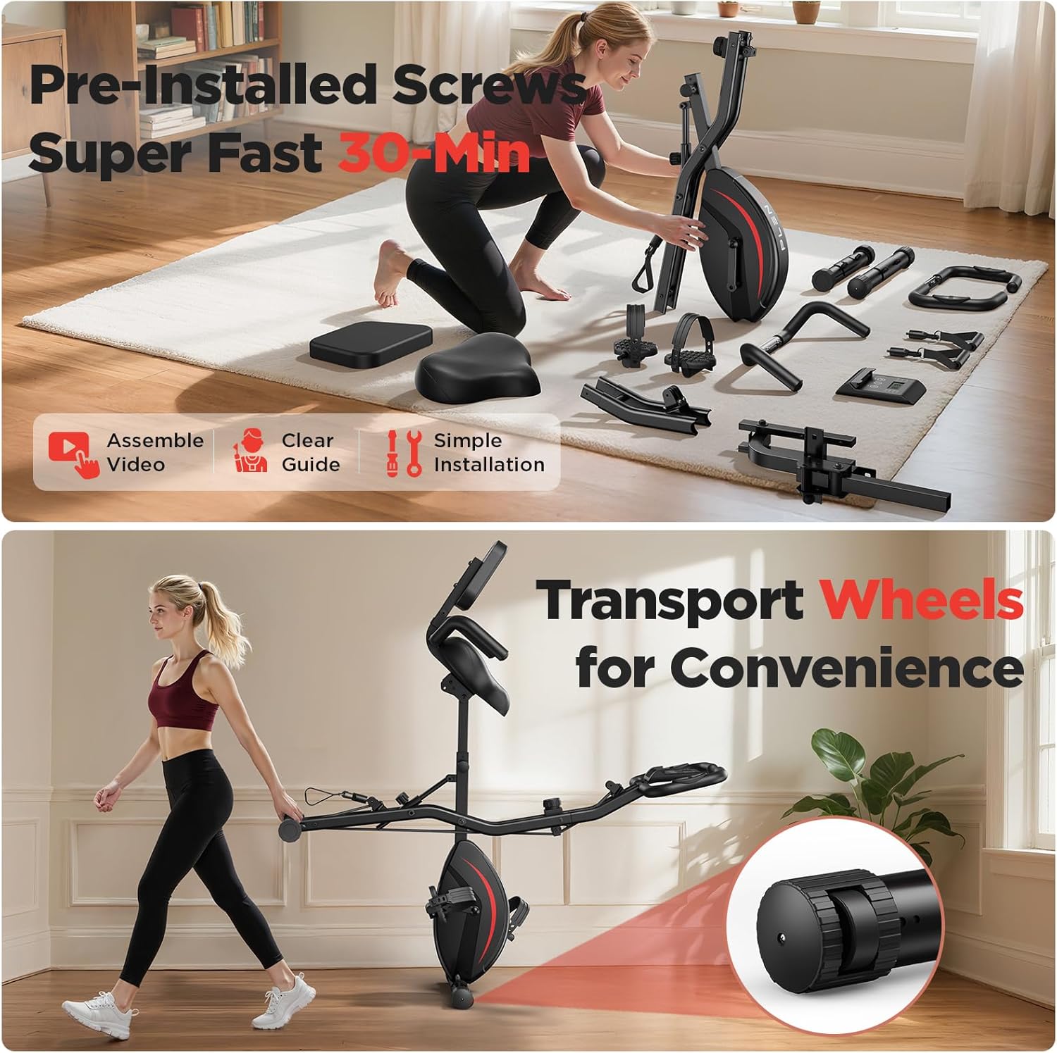 SPACE-SAVING FOLDABLE DESIGN: The innovative X-shaped structure makes this exercise bike sturdy and safe when in use, and takes up only 20″ x 20″ of floor space when folded. The included transport wheels make it easy to move and store.