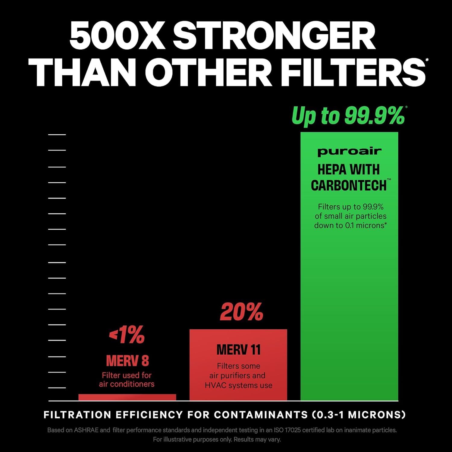 Powerful Air Filter: PuroAir HEPA air purifiers for home feature a powerful 3-layer filtration system—a pre-filter, HEPA filter, and activated carbon—that filter up to 99.9% of pollutants, including dust, pollen, smoke, pet dander, and VOCs. PuroAir air filters can filter particles 700X smaller than the size of a human hair.* (Based on filter performance standards and independent testing on inanimate particles in an ISO 17025 laboratory, 2024.)