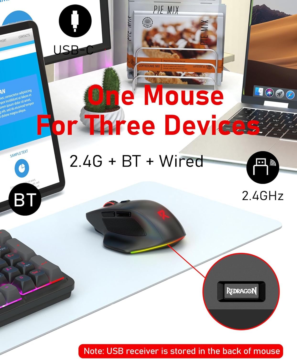 【Connect The Way You Like】Cables truly will affect your detailed battle reaction. Redragon BM-2995 multi-device mouse adopts Bluetooth, USB receiver, type-c wired connection. The Bluetooth gaming mouse can connect to 3 devices and switch at any time. Simple and convenient to game or work from the PC to the iPad, or laptop to MacBook. Note: The USB receiver is stored in the back of the mouse