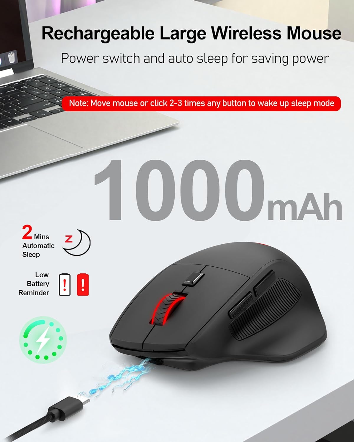 【Ultra Long-Lasting】This rechargeable gamer mouse has a built-in 1000mAh battery, an ultra-low power chip, and a 1000Hz polling rate to further optimize the mouse’s power consumption. With smart sleep mode, it saves power by standby after 2 inactive minutes, just 2-3 clicks to wake. This gaming mouse can be used wired while charging, allowing you to use it uninterruptedly.