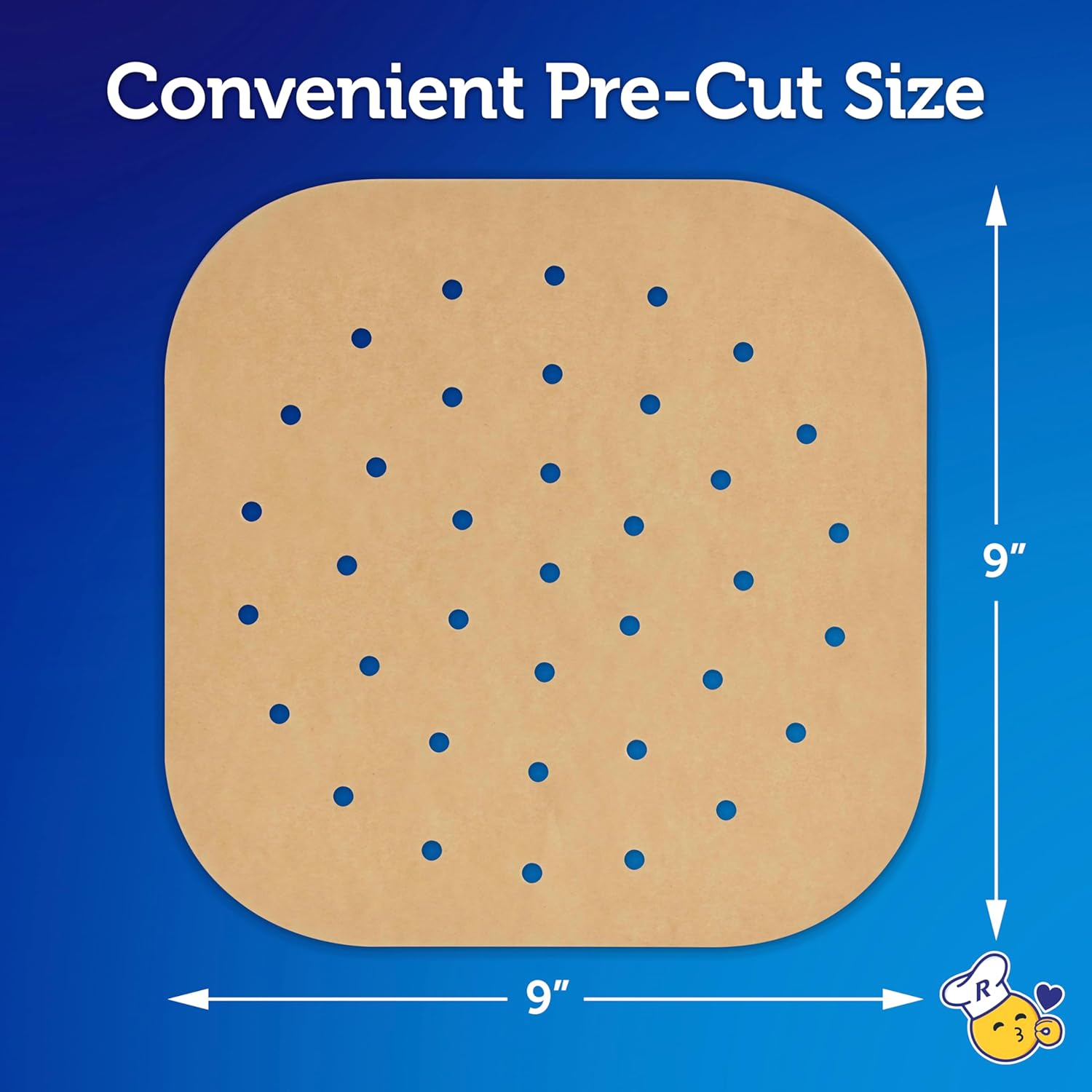 Package Includes: Fifty (50) Reynolds Kitchens Unbleached Parchment Air Fryer Liners, measuring 9 in. x 9 in. each