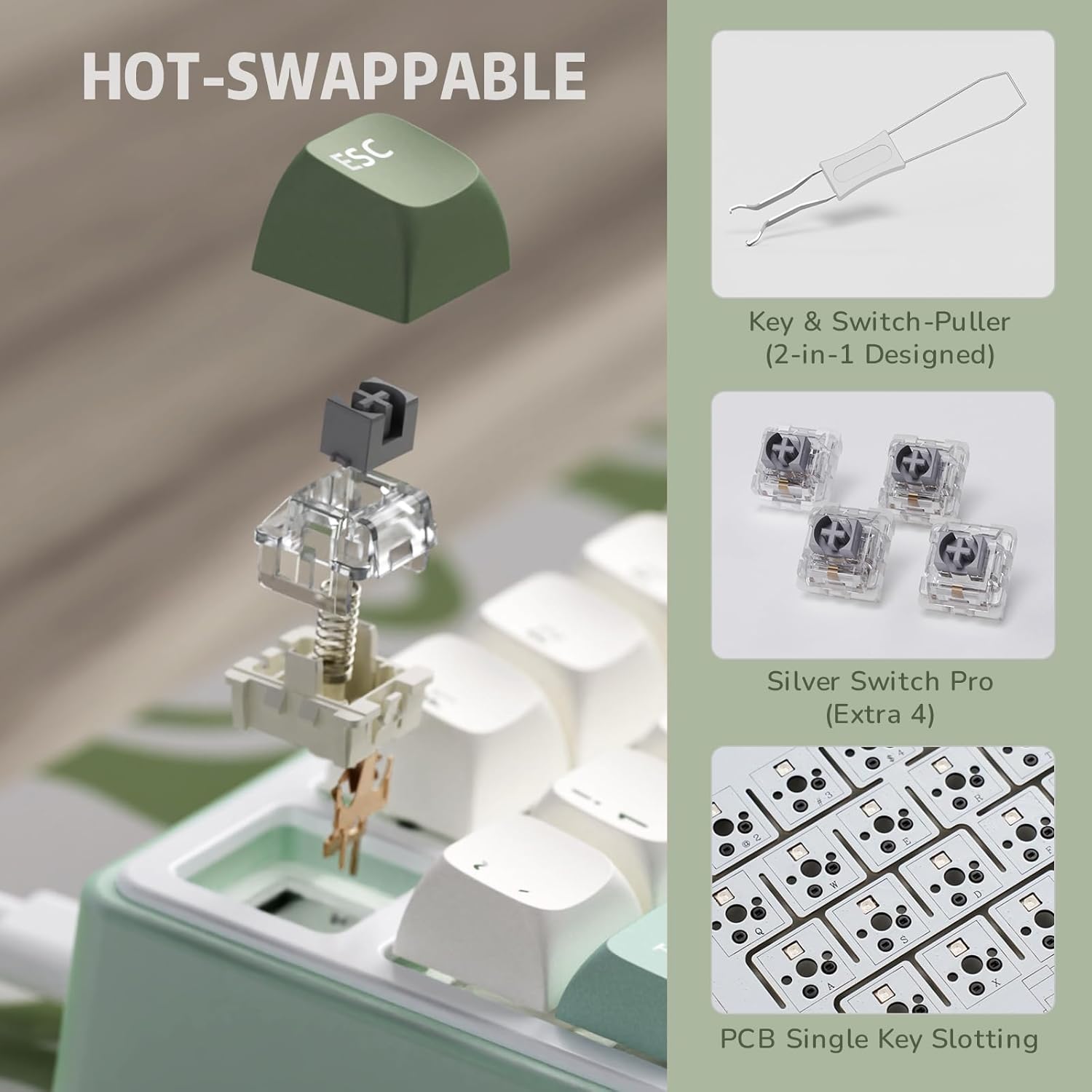 Hot-Swappable Linear Switch – The R75 creamy keyboard adopts silver Pro switches with shorter key travel and a more stable shaft design. These pre-lubed linear switches provide a smooth typing feel with a crisp, creamy sound. The PCB is compatible with both 3-pin and 5-pin switches, allowing even keyboard beginners to easily DIY their own keyboards without soldering issues.