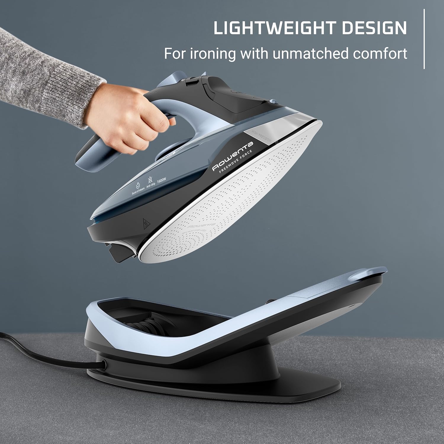 CORD-FREE CONVENIENCE: A lightweight, cordless iron for clothes offering total freedom of movement, with fast recharge on the base for effortless ironing