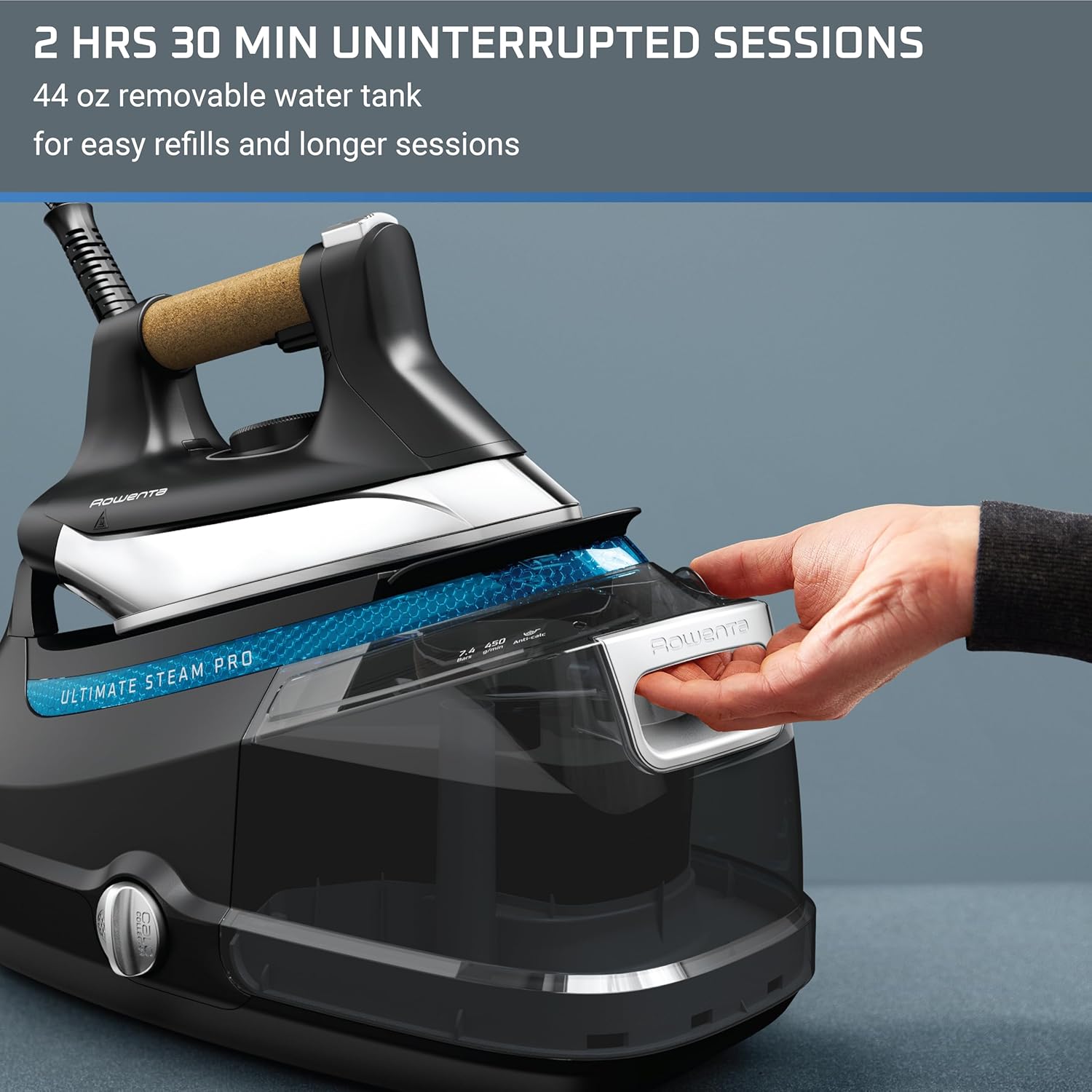 LONGER SESSIONS: Want to feel the pleasure of ironing up to 2hrs30min? Your Rowenta steam generator iron steamer for clothes makes it possible. It is ready for use in 3 min and the extra-large 1.3L/44-oz. removable water tank offers easy refills