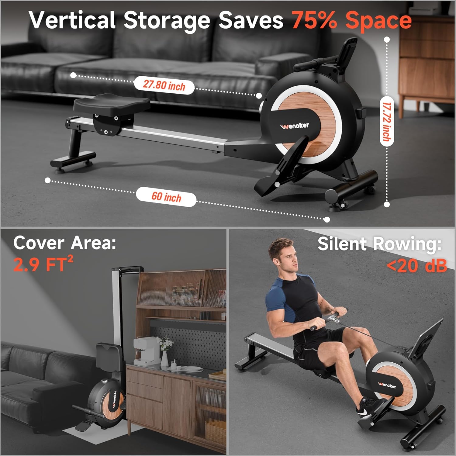 [Space-Saving & Easy to Move] The portable rowing machine is designed to fit perfectly in small apartments, homes, and offices. With a compact size of just 3sq. ft, it can be easily stored vertically, saving over 80% of space when not in use. Plus, the built-in transport wheels make it simple to move around, offering a convenient, space-efficient solution for your home gym.