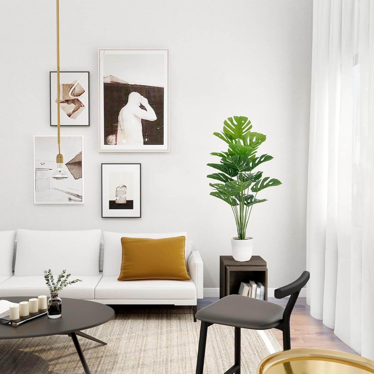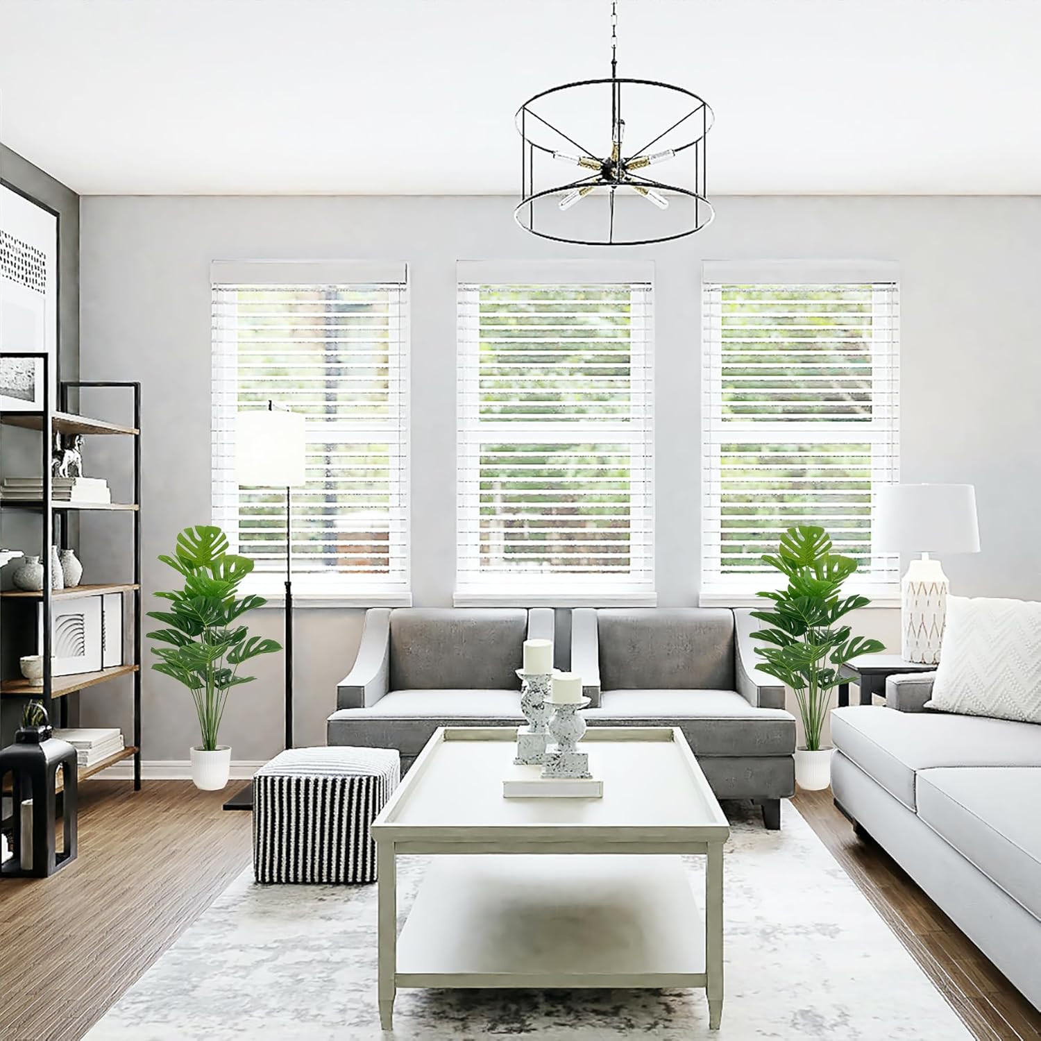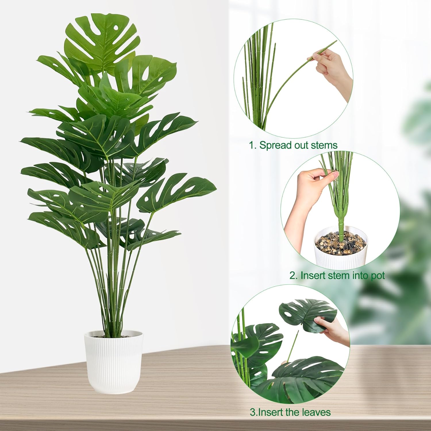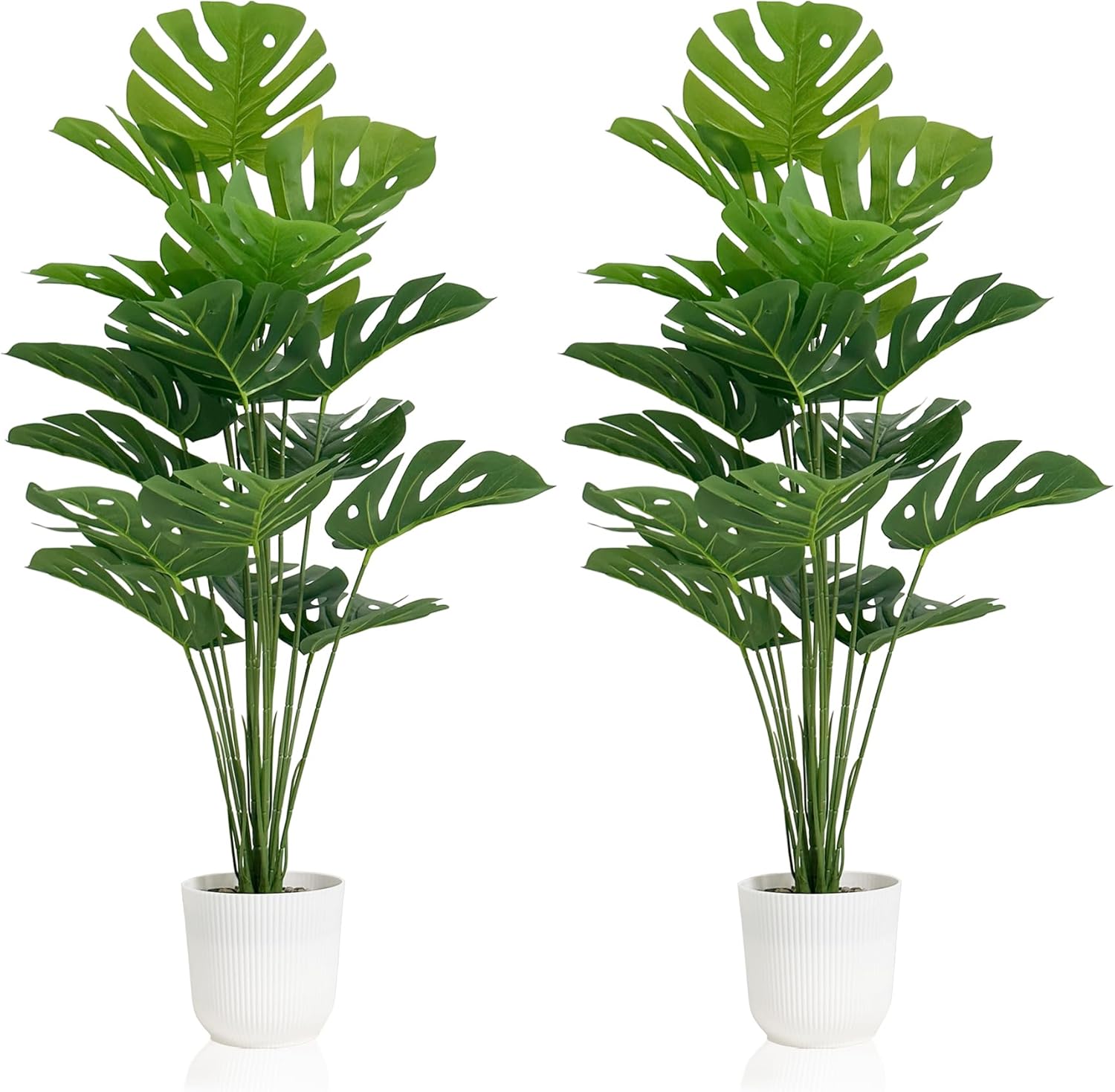 Packaging and Size: The package comes in 2 set of artificial monstera plants, including 2 white plastic pots with small stones, 2 stems of plants and 2 set of greenery leaves. Each of artificial monstera plants measures 32 inch long, 8 inch wide.