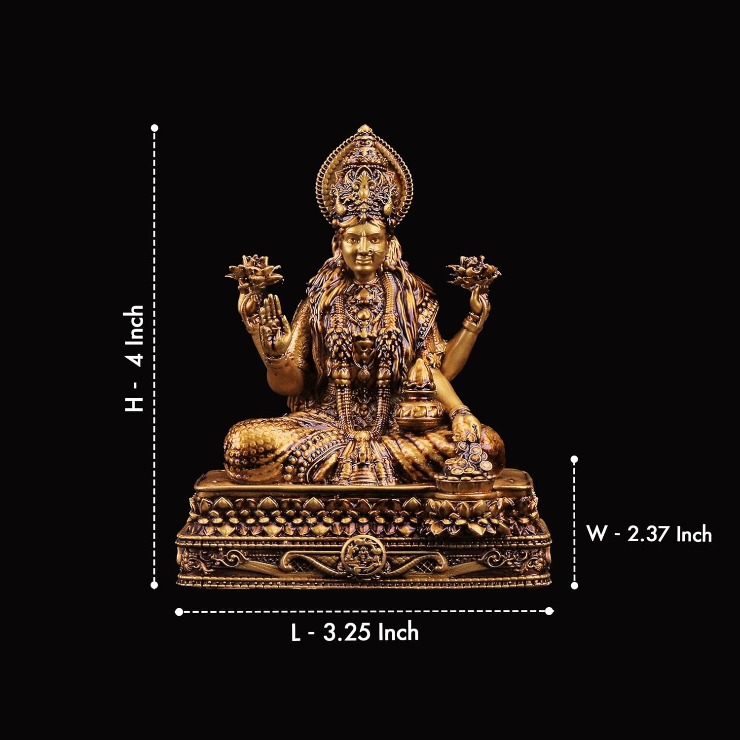 Dimensions (L x W x H) – Designed to sit securely without occupying too much space, the dimensions of the Shree Laxmi Car Dashboard Idol are: Length – 3.25 inches, Width – 2.37 inches, Height – 4 inches. Its compact size ensures it fits seamlessly on most car dashboards without obstructing your view. The well-balanced proportions also make it suitable for placement in small spiritual setups or office environments, offering blessings and elegance in a perfectly sized package.