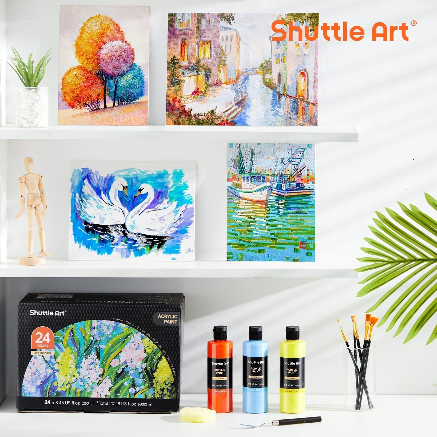 24 COLORS BULK PAINT : Shuttle Art acrylic paint set contains 24 commonly used colors acrylic paints in bottles, and each contains 250 ml/8.45 oz large volume paint, ideal for artists, beginners, kids and adults for painting and crafting