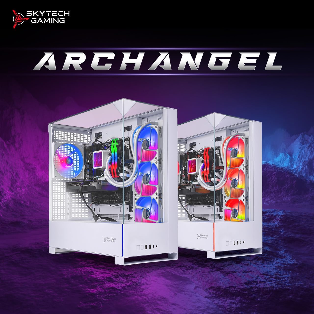 High-spec AIO liquid coolers used, delivering unmatched cooling performance for a perfect operational experience and unparalleled cooling performance. With hardware unrestricted by temperature limits, you can unleash its full potential. Whether gaming, creating, or working, you’ll never suffer from thermal throttling again. | Skytech Archangel 5 Gaming Case with Tempered Glass, White | 1 Year Warranty on Parts and Labor | Free Technical Support | Assembled in the USA