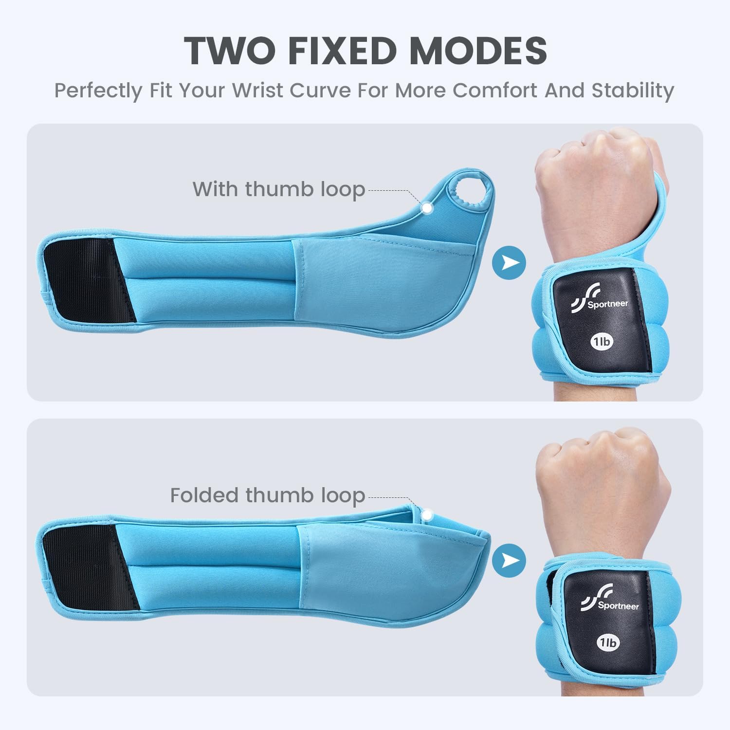 Dual Fixation Modes for Stability and Flexibility: Sportneer wrist weights features two adjustable modes: The thumb hole for extra stability during high-intensity workouts and a loop-free option for enhanced finger mobility. Stay secure and comfortable in any activity