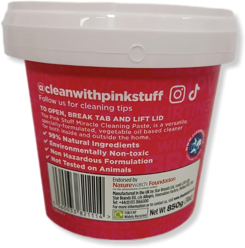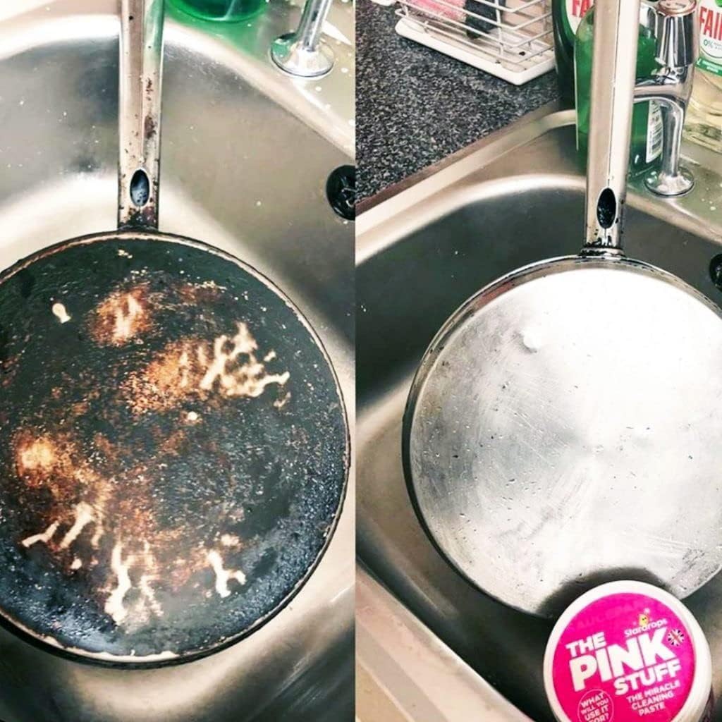 The Pink Stuff Miracle Cleaning Paste is perfect for cleaning dirt, grime and stains on saucepans, cooker tops, sinks, uPVC, barbecues, ceramic tiles, glass, showers, garden furniture, paintwork, boats, brass and rust… the list is endless.
