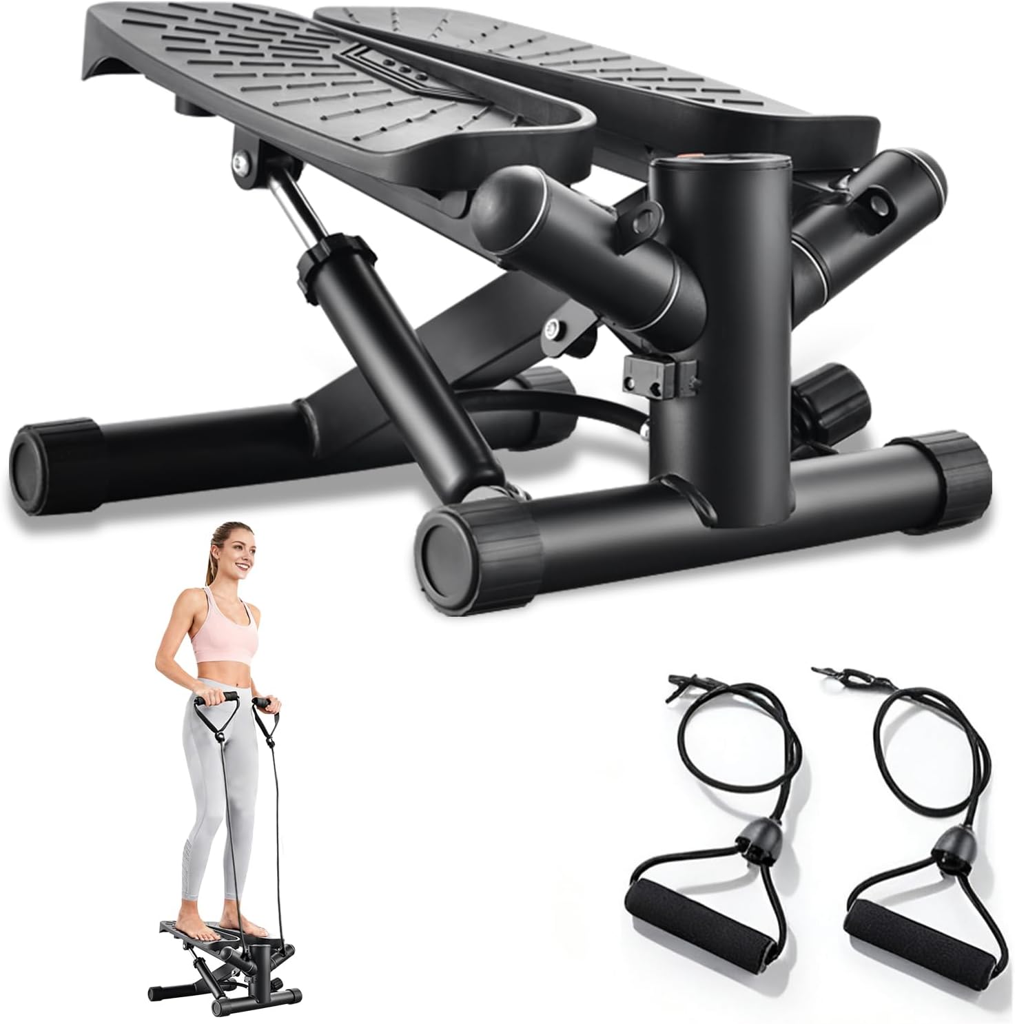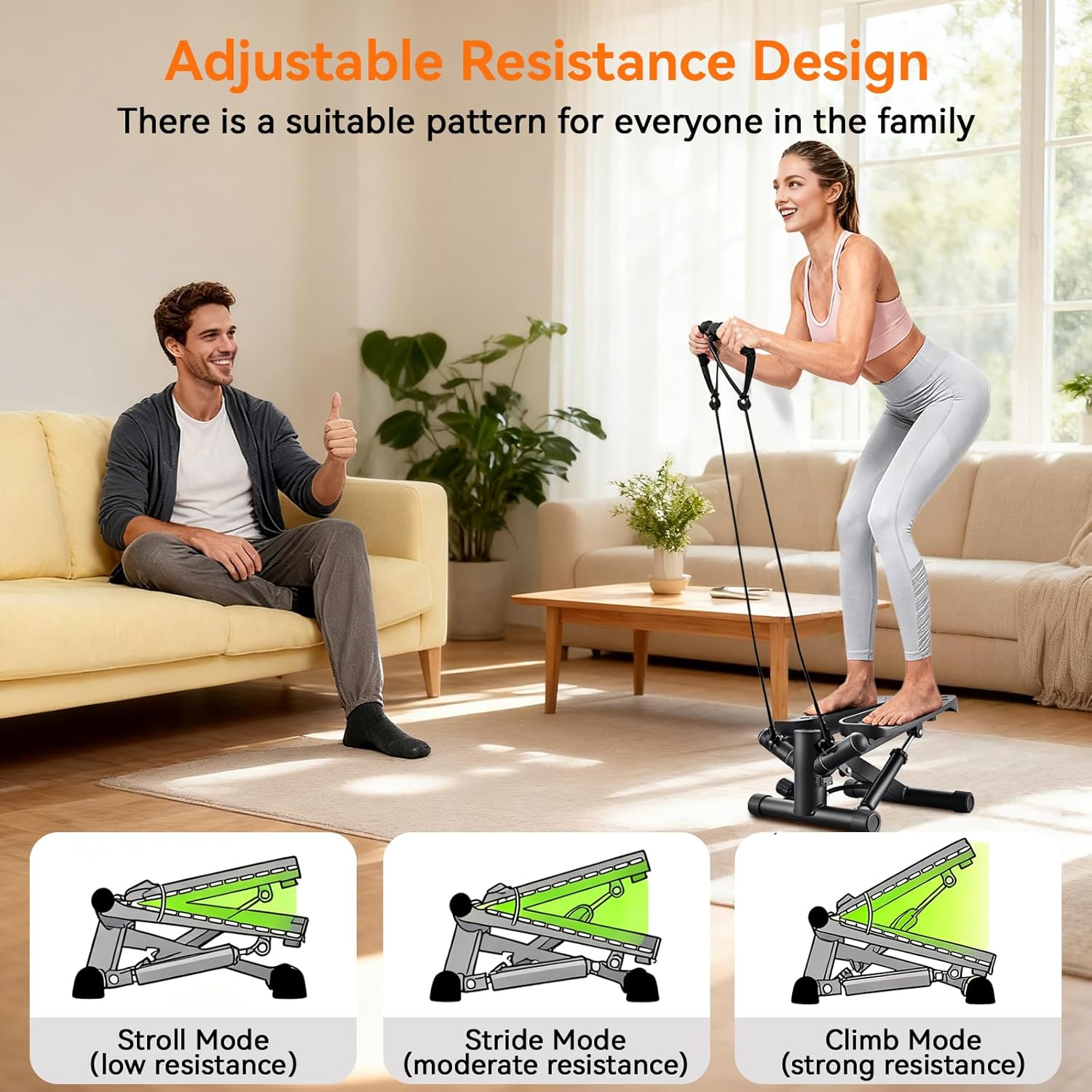 【Customizable Stride & Resistance】Uniquely adjustable stride knob (20.5-27.5cm) lets you control intensity. Low for endurance, high for calorie burn – plus detachable resistance bands for full-body toning.