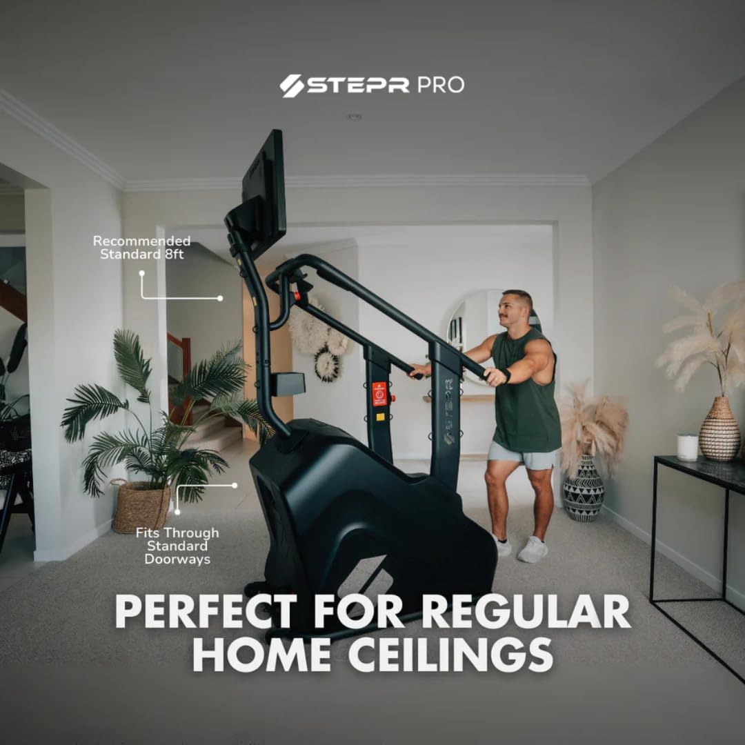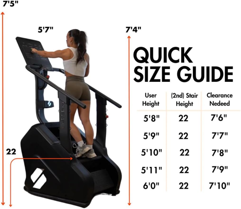 Compact Footprint: Home stair master designed to fit through standard doorways. We recommend just a standard 8ft ceiling! 53″ x 32.6″ x 89″ & 363 lbs. Stadium stairs: 18″ W x 11″ D x 4.9″ H 7″
