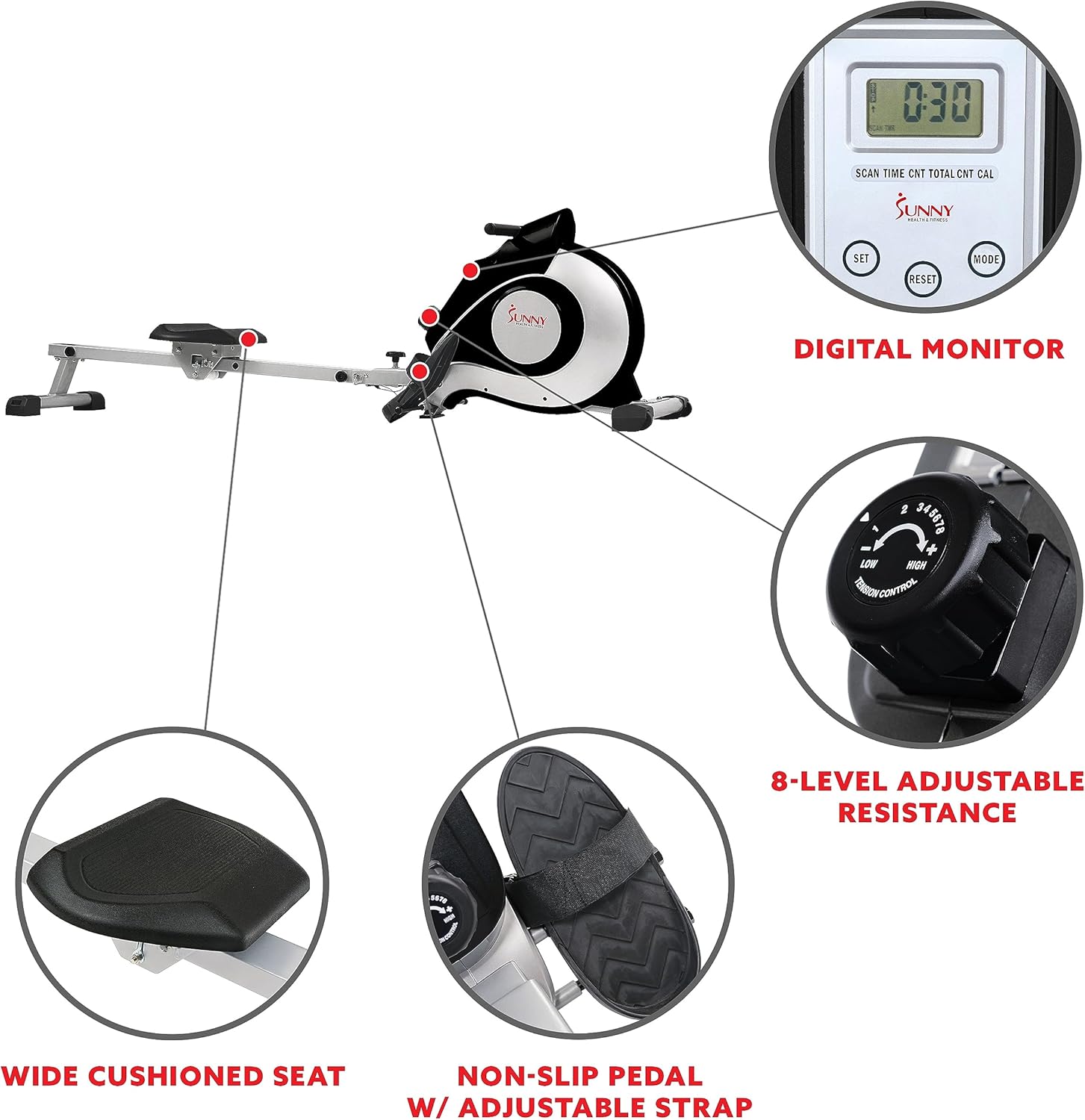 Experience the epitome of home fitness versatility with the Sunny Health & Fitness rowing machine. Featuring an innovative extra-long slide rail, this equipment accommodates users of all heights, allowing for effortless adjustment to ensure a comfortable and personalized workout experience. Additionally, its whisper-quiet operation ensures uninterrupted exercise sessions, making it suitable for any time of the day without disturbing others. Keep track of your progress effortlessly with the large LCD console, displaying vital workout metrics such as time, calories, and total count, while the convenient scan mode helps you stay focused on achieving your fitness goals. Crafted with a focus on durability and functionality, this rowing machine boasts textured non-slip foot pedals and secure foot straps, guaranteeing stability and safety during even the most vigorous workouts. Equipped with transportation wheels, moving and storing this equipment is a breeze, eliminating the need for heavy lifting or excessive strain on muscles. Experience a complete full-body workout with adjustable resistance levels, catering to users of all fitness levels, and enjoy the convenience of its compact and foldable design, making it perfect for any home gym setup. Backed by over 20 years of excellence, Sunny Health & Fitness ensures top-quality equipment with a commitment to providing an unmatched fitness experience for everyone.