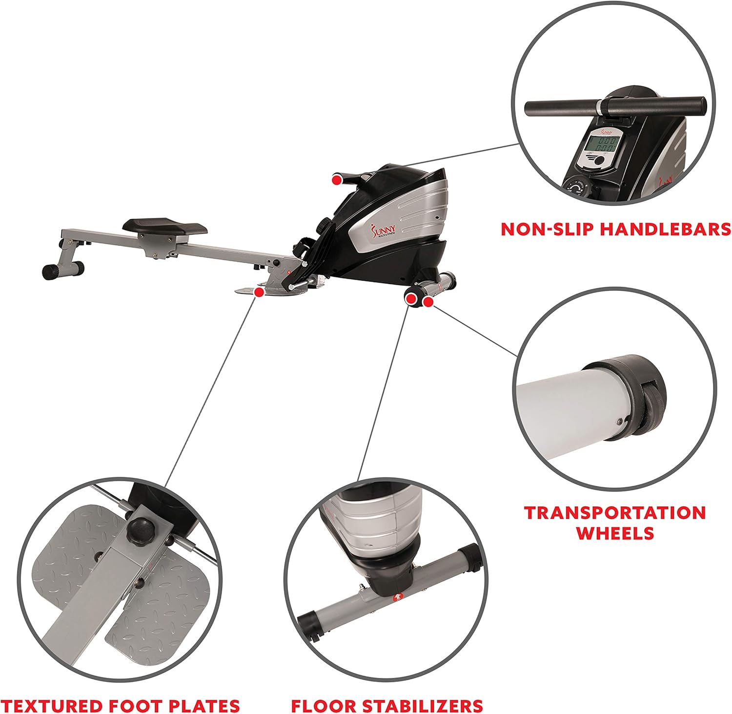 【TRANSPORTATION WHEELS】 Lift, tilt and push your rowing machine away for storage or easily reposition it within your home gym.