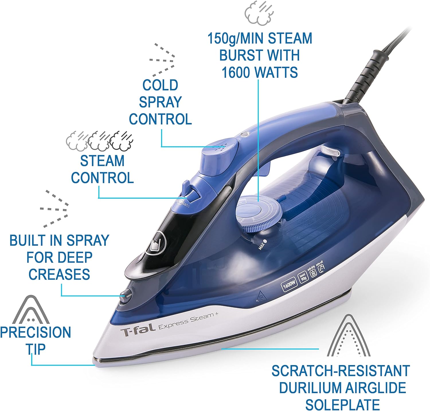 The T-fal Express Steam Iron features our new, patented Durilium AirGlide soleplate for flawless glide and fast ironing. Equipped with 1600 watts of power for a fast heat-up and 90 g/min of continuous steam output. Express Steam clothes iron is equipped with the T-Fal Durilium Airglide Technology soleplate for flawless glide and fast ironing. 1600W of power along with 90g of steam boost will help you get quick results in no-time. The large water tank and the automatic shut-off of this iron will ensure you a stress-free session.