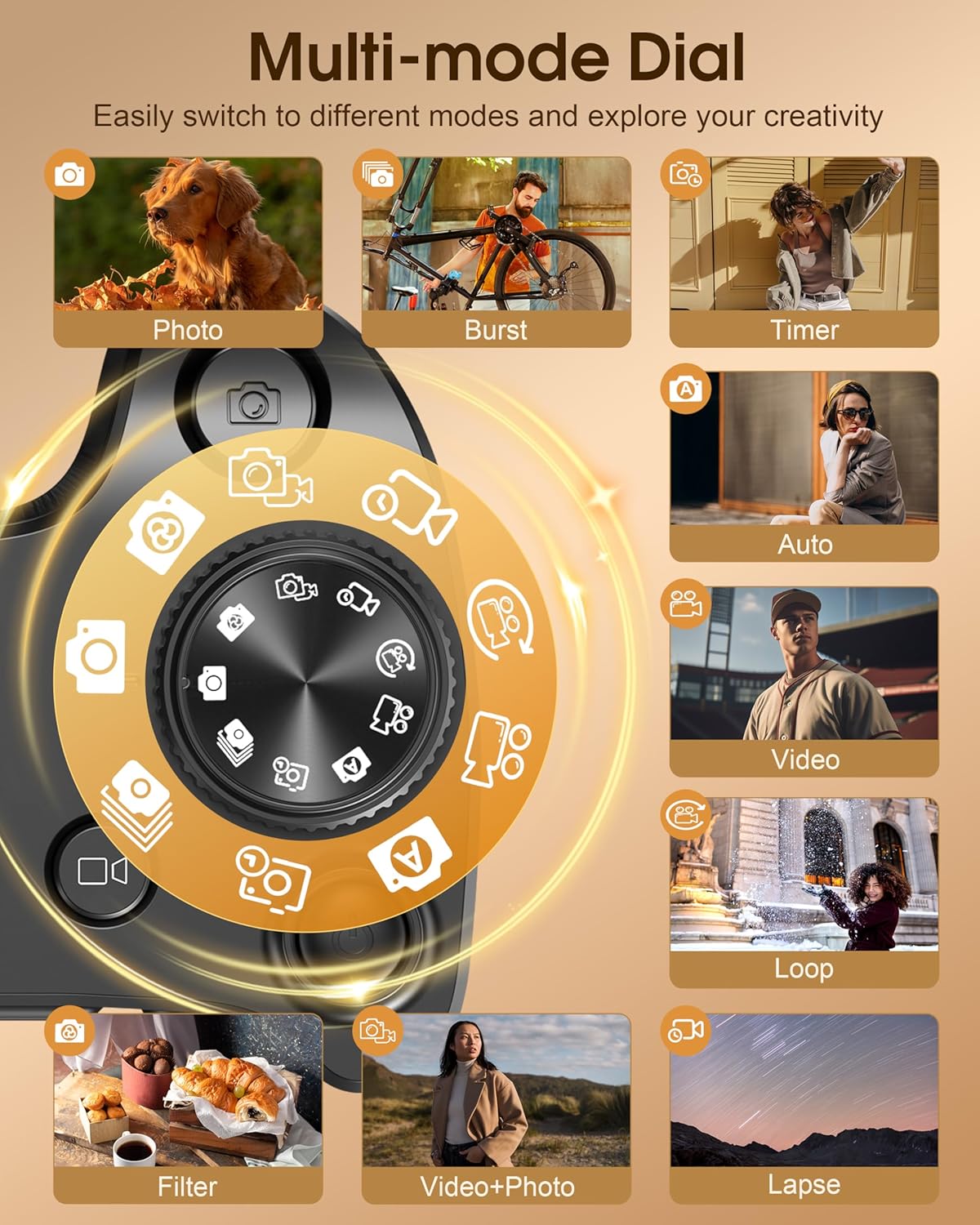 👉4-inch IPS HD Touchscreen & Mode Dial – The Vlogging camera’s 4-inch IPS HD touchscreen offers a more intuitive control experience, delivering vibrant, true-to-life colors for the best visual experience during both shooting and playback. The mode dial allows you to easily switch between shooting modes, making it perfect for both everyday moments and special gatherings