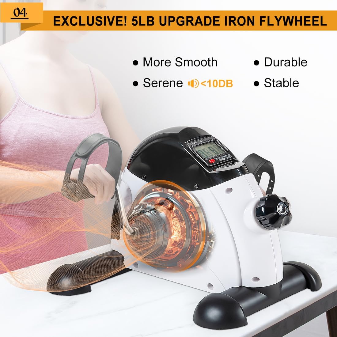 【HEAVY FLYWHEEL】Unlike ordinary plastic flywheels, this seated pedal exerciser features a heavy metal flywheel to improve stability. An internal 5-pound steel flywheel makes it effortless to use in for a long time, and can bear more than 400 pounds.