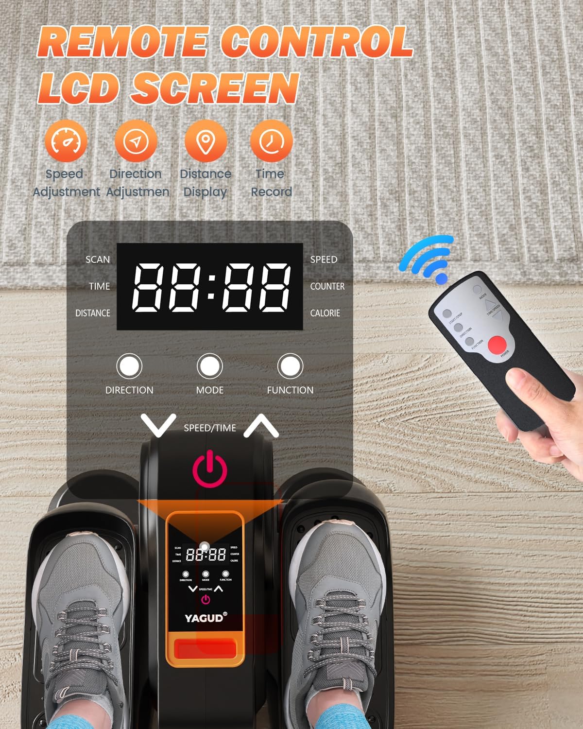 LCD DISPLAY & REMOTE CONTROL: Yagud portable elliptical training machine with the LCD display, you can track speed, distance, counter, time and calories in real time. Pedal exerciser for seniors feature with thoughtful remote control allows you to change mode without bending over, reducing strain on your back