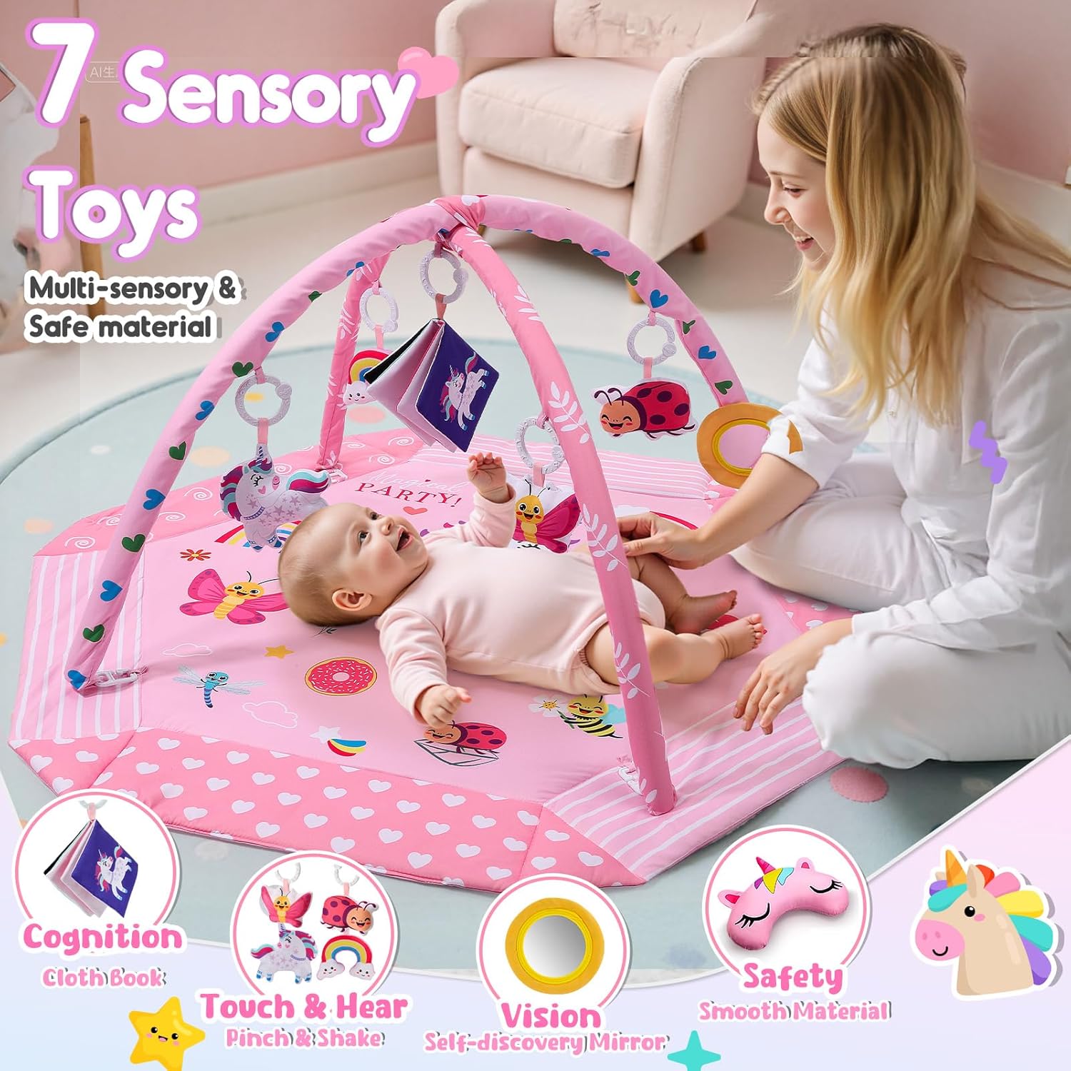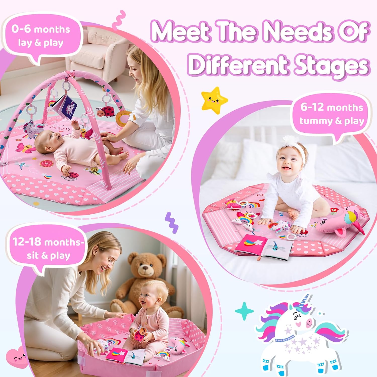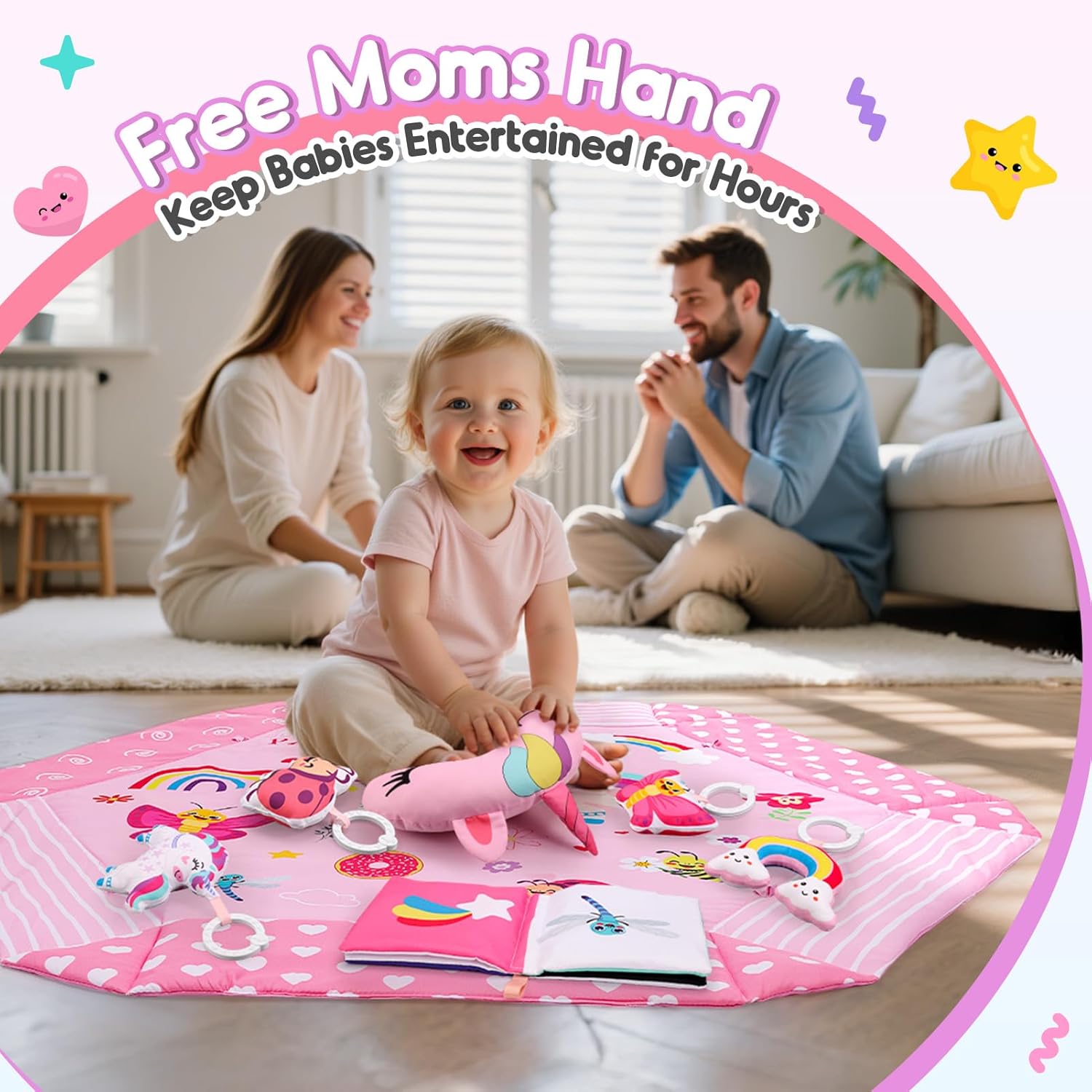 【9-in-1 Baby Activity Play Mat】- Designed with your little one’s development in mind, this Unicorn-themed baby activity play mat provides everything needed for a baby’s early growth. It comes with 6 interesting enlightenment toys (4 sensory a toys, 1 self-discovery mirror, 1 cognitive cloth book), 1 tummy time moon, and a large playmat. Fully meet the baby’s growth needs.