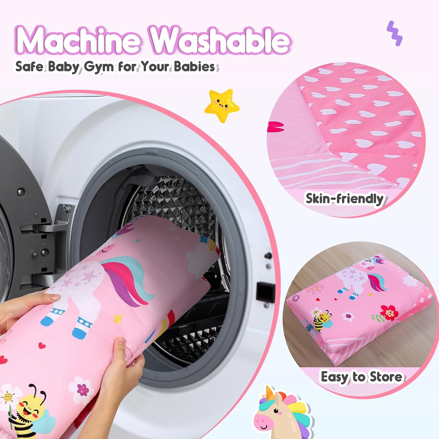 【Safe & Washable】- Made with high-quality, thick fabrics that are soft and smooth to the touch, this baby floor play mat is gentle on your baby’s sensitive skin. It is machine washable, making it easy to keep clean and hygienic. The mat provides a cushioned surface for sitting, crawling, and standing, keeping your baby safe during playtime.