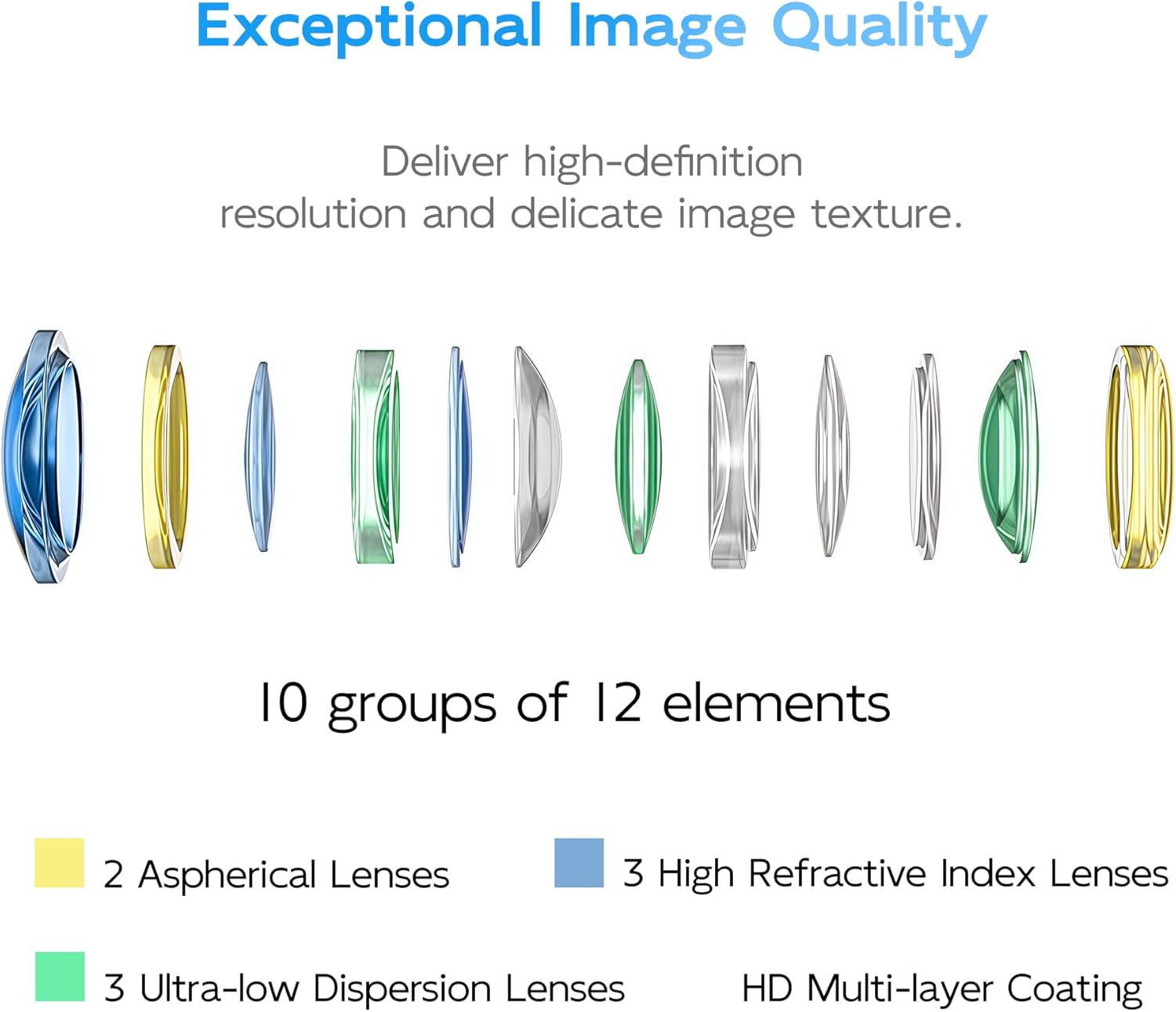 Advanced Optical Design:Featuring 3 ED elements for reduced chromatic aberration, 3 high-refractive index elements for edge-to-edge sharpness, and 2 aspherical elements to minimize distortion, this lens ensures crisp, accurate images. Advanced coatings further reduce flare and ghosting for clear, high-contrast results in any light.