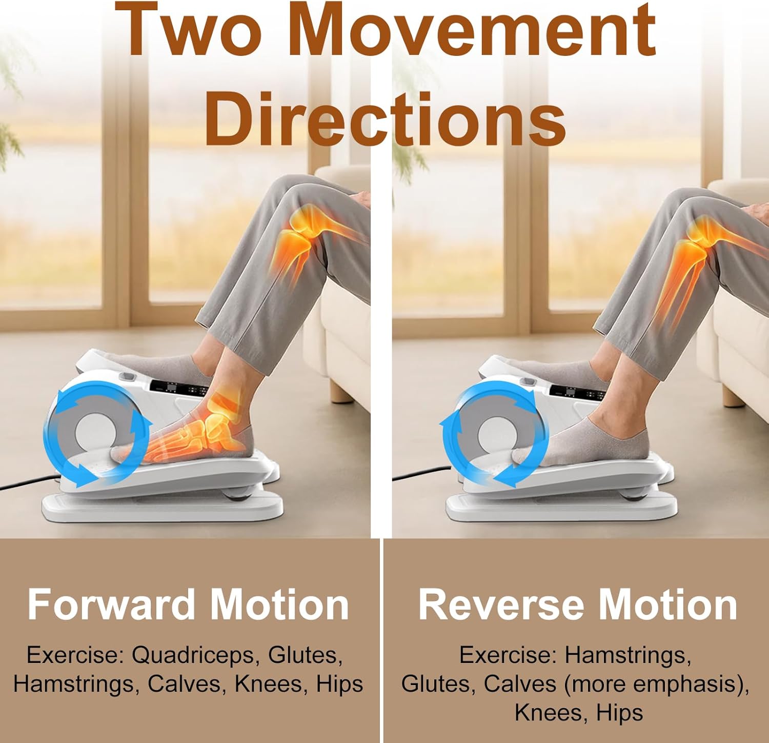 Extended Power Cord & RF Remote: Power cord is extended to 8.2ft (most are 3.28ft in marketplace) for flexible placement options. This leg exerciser while sitting for seniors has enhanced radio frequency remote provide more stable & responsive control than ordinary infrared remotes. You could just sit and use the remote to control all functions from any angle
